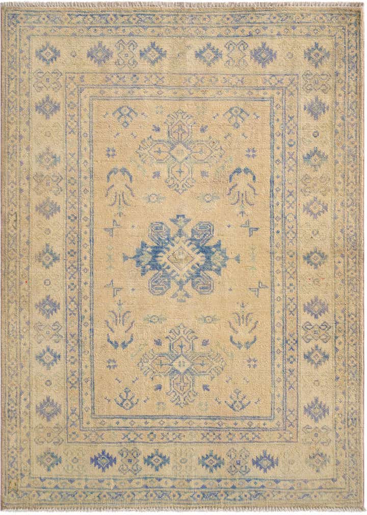 Primary color is Tan. Colors in this rug include: Tan, Navy Blue, Light Brown, Light Blue.