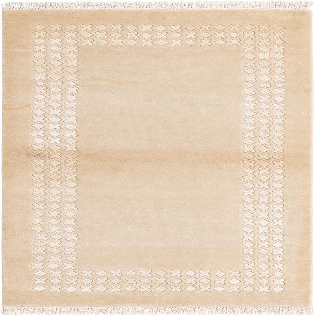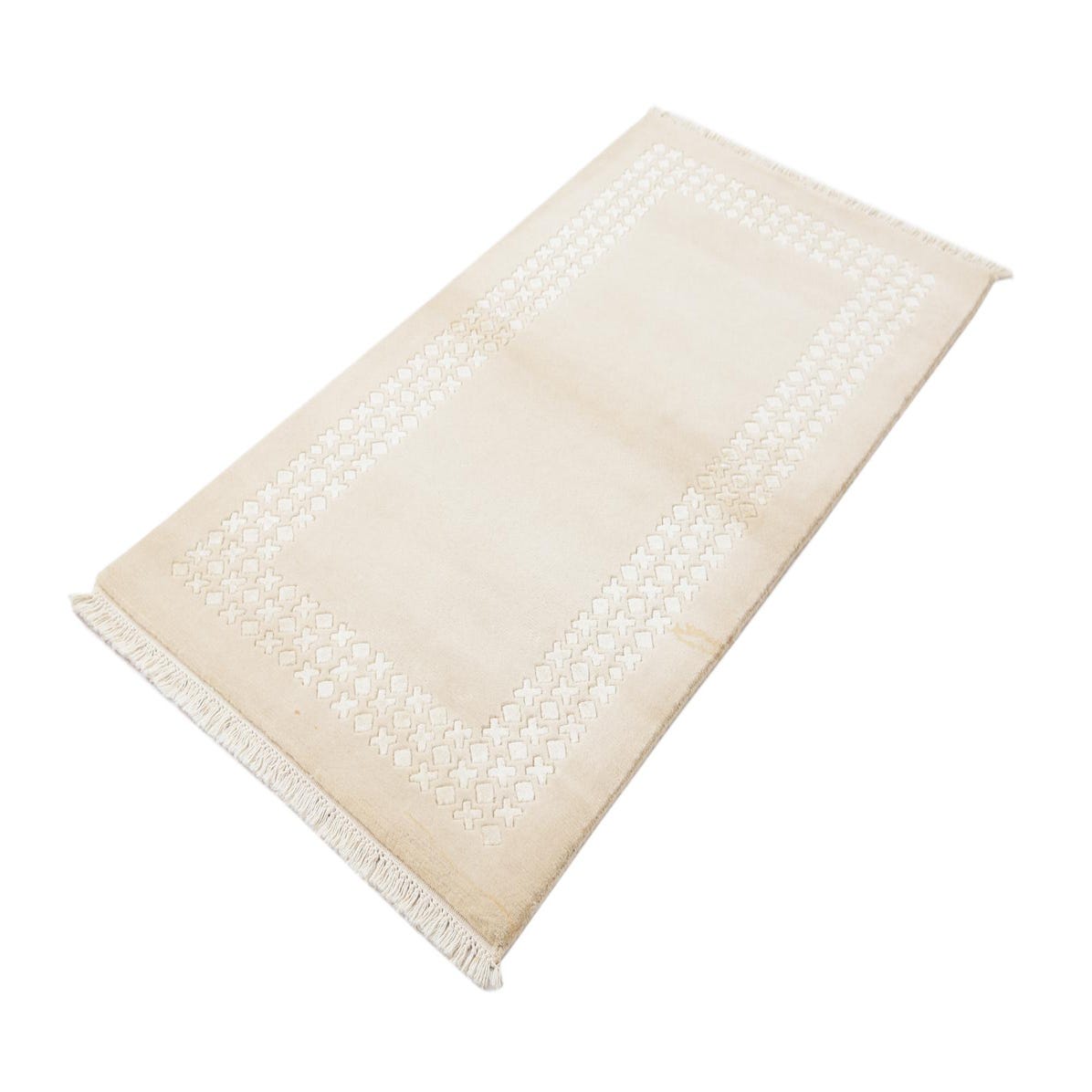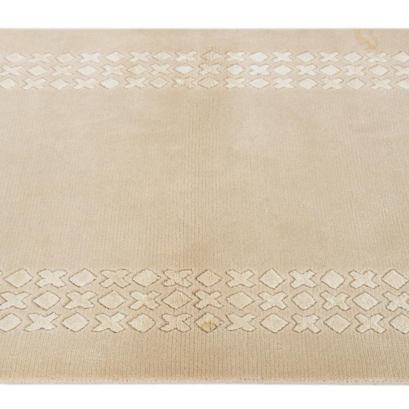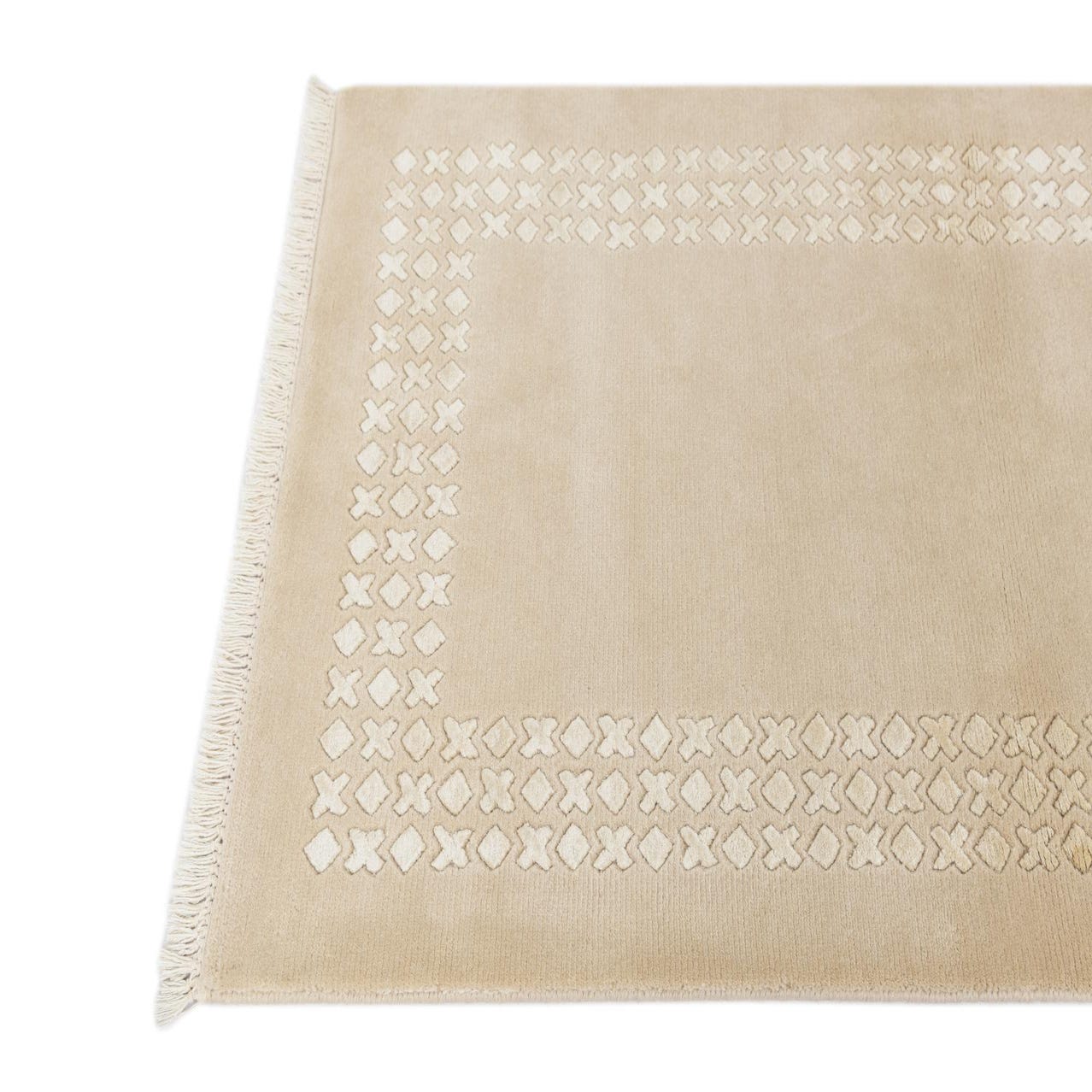 A soft tan field provides a warm, neutral backdrop for a subtle, raised border of beige geometric motifs. Small diamond and “X” shapes run in two parallel bands to form a clean inner frame, while short fringes at each end add a handcrafted finish. Hand-knotted from 100% wool, the pile has a gentle, resilient nap with a low lustre; the cut-loop texture of the pattern lifts lightly from the ground, giving both visual depth and a pleasant tactile contrast underfoot.