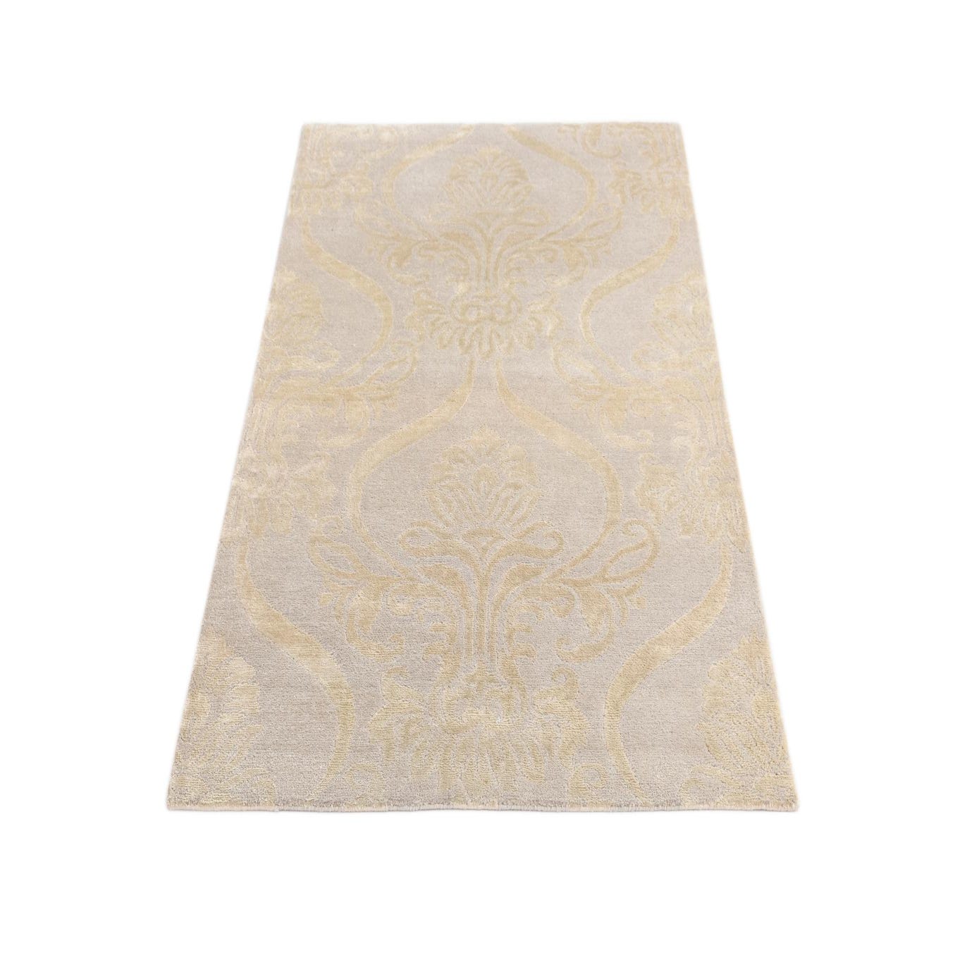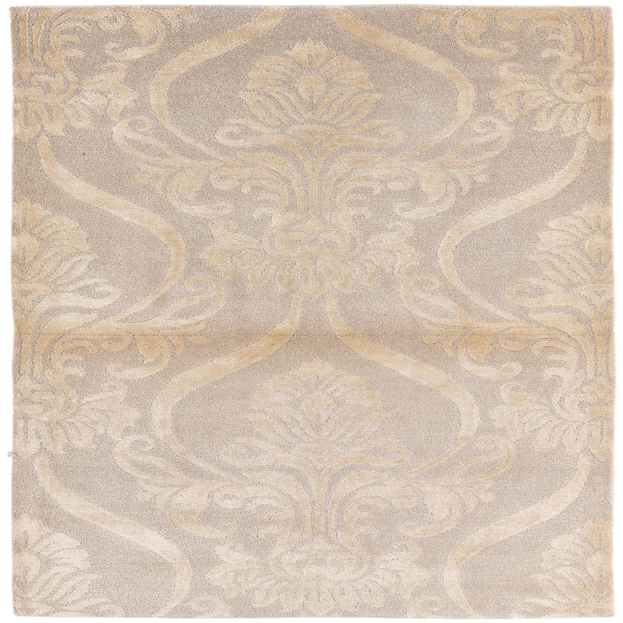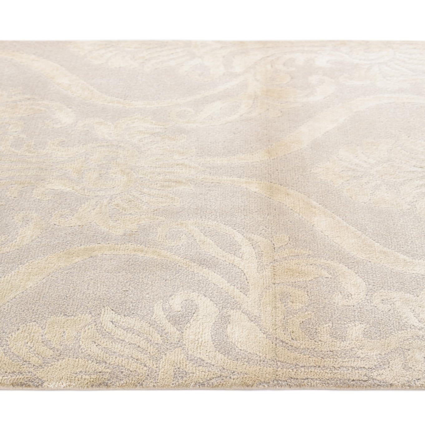 A classic damask motif is woven into a warm tan field, its scrolling arabesques and floral medallions rendered in soft cream and pale gold accents. The pattern is gently raised against a finely knotted ground, creating subtle sculpted relief that catches light differently across the surface. Hand-knotted in 100% wool, the pile has a dense, velvety feel — soft underfoot with enough structure to hold the design definition.