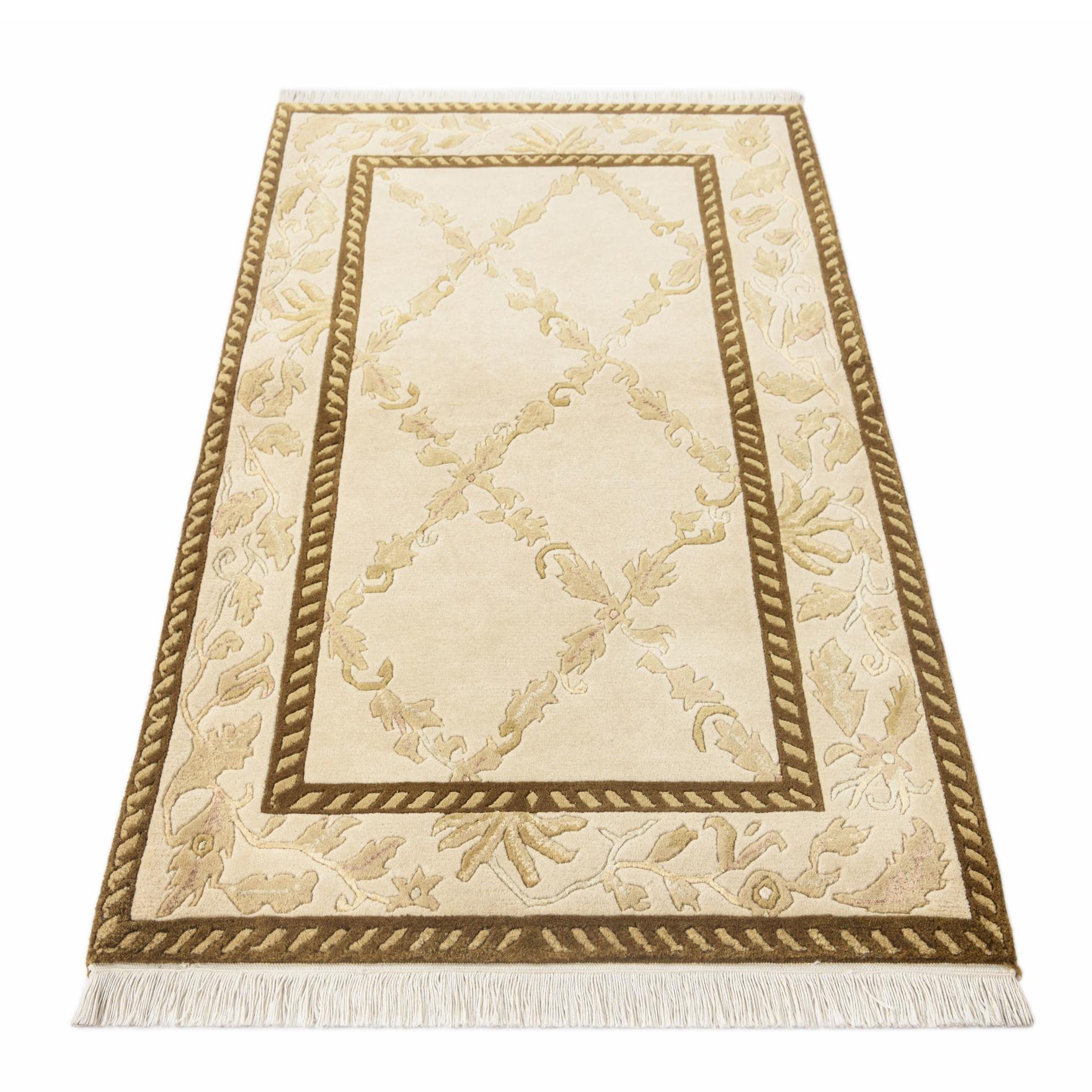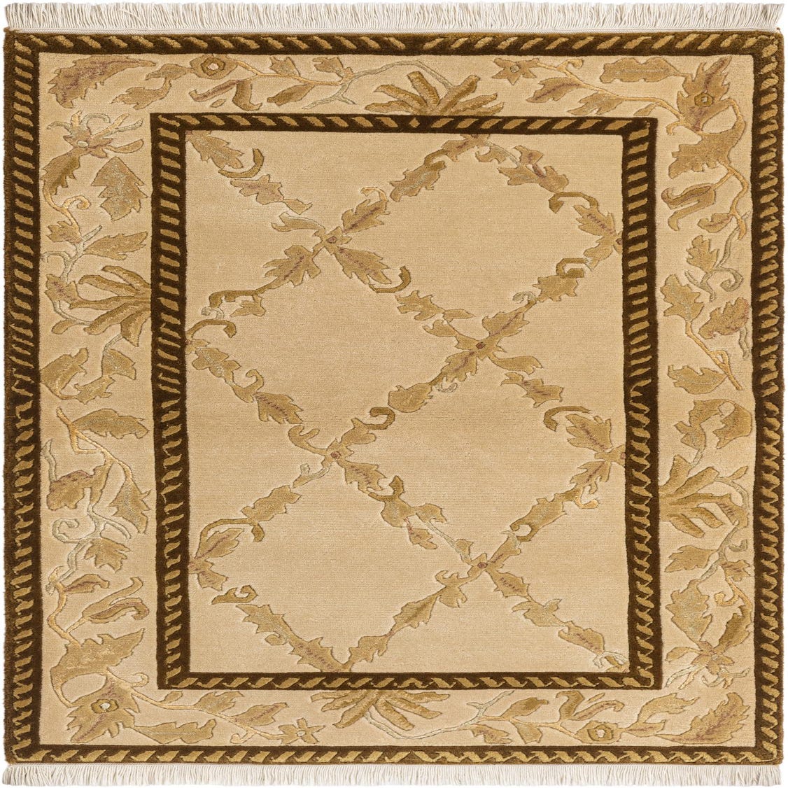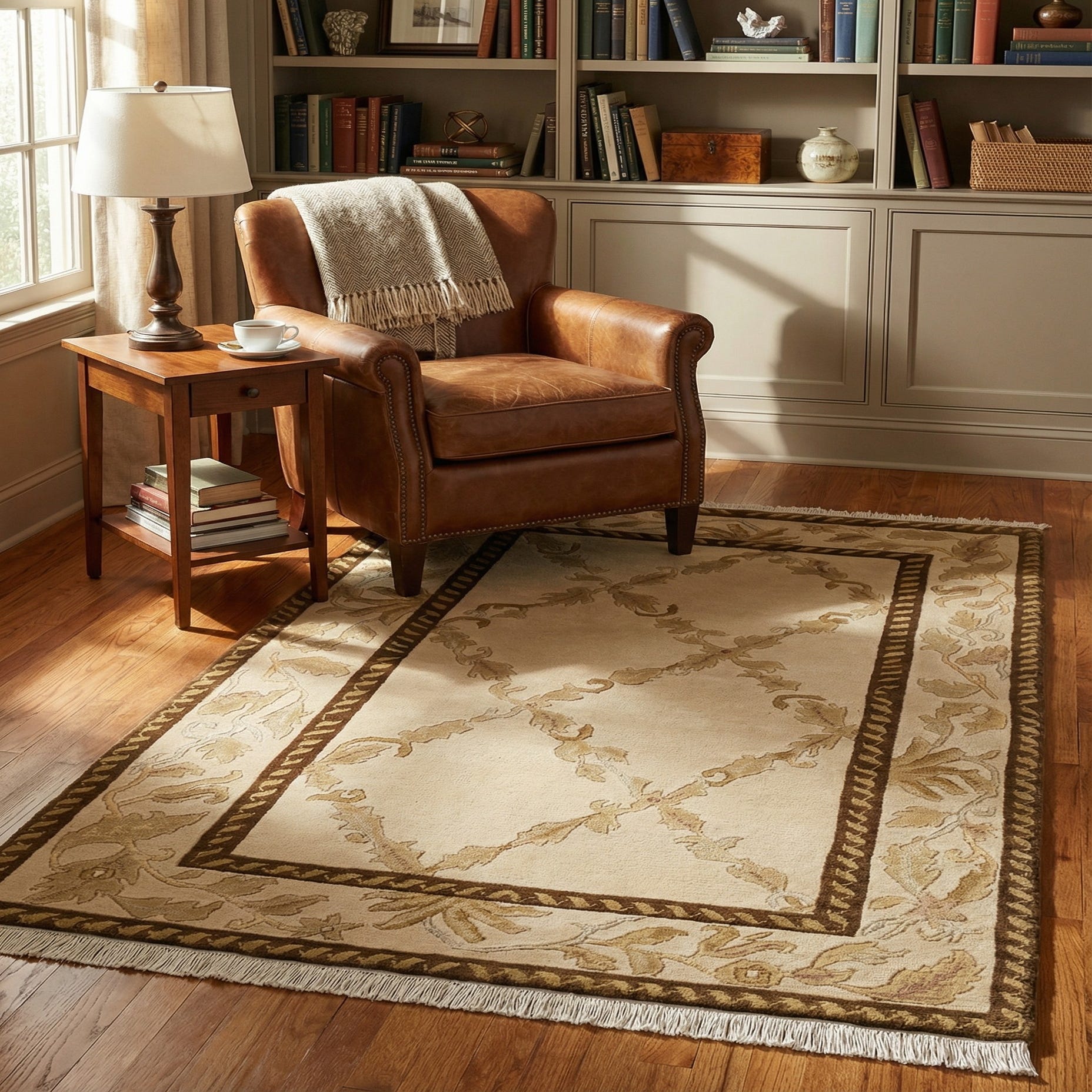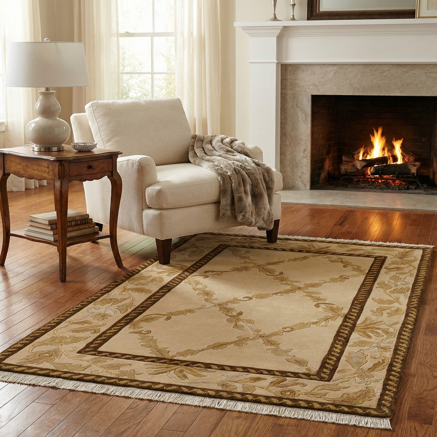 A classic, traditionally inspired design rendered in warm neutrals and earthy tones. The tan field provides a calm, even ground for a diagonal vine-and-leaf trellis worked in light brown and olive, while a deep brown inner border with a twisted-rope motif frames the composition. An outer foliate border repeats the leafy pattern, giving the rug a layered, finished look. The ends are finished with short fringes that add a subtle, handcrafted touch.