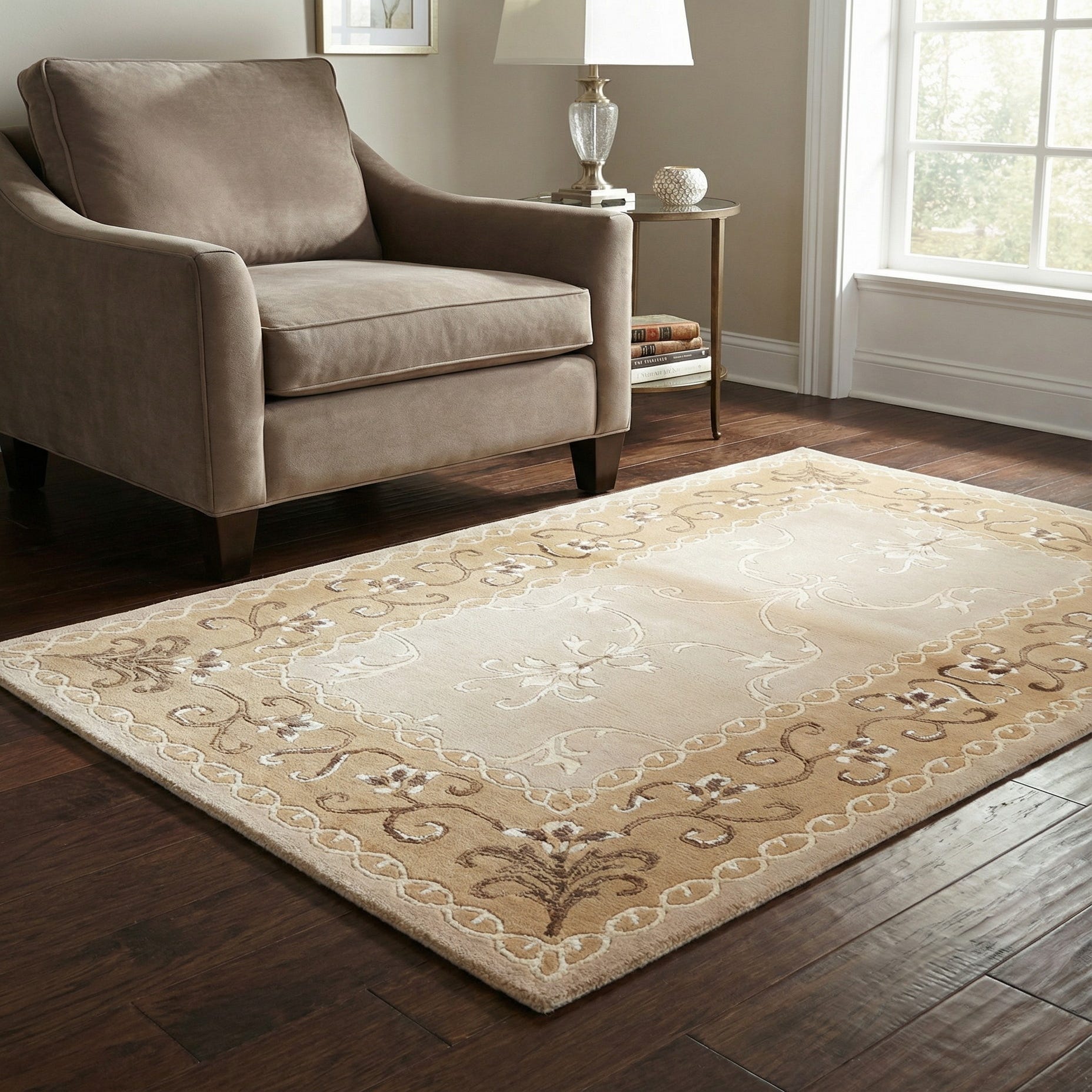 The Darya collection presents a refined 3x5 hand-knotted rug crafted from a harmonious blend of wool and silk, creating a plush and durable weave. The rug features a classic floral and vine design, enlivened with a central medallion that anchors the composition. The pattern is accented with shades of tan, beige, brown, light brown, and olive, set against a warm tan background that provides a versatile and inviting palette.