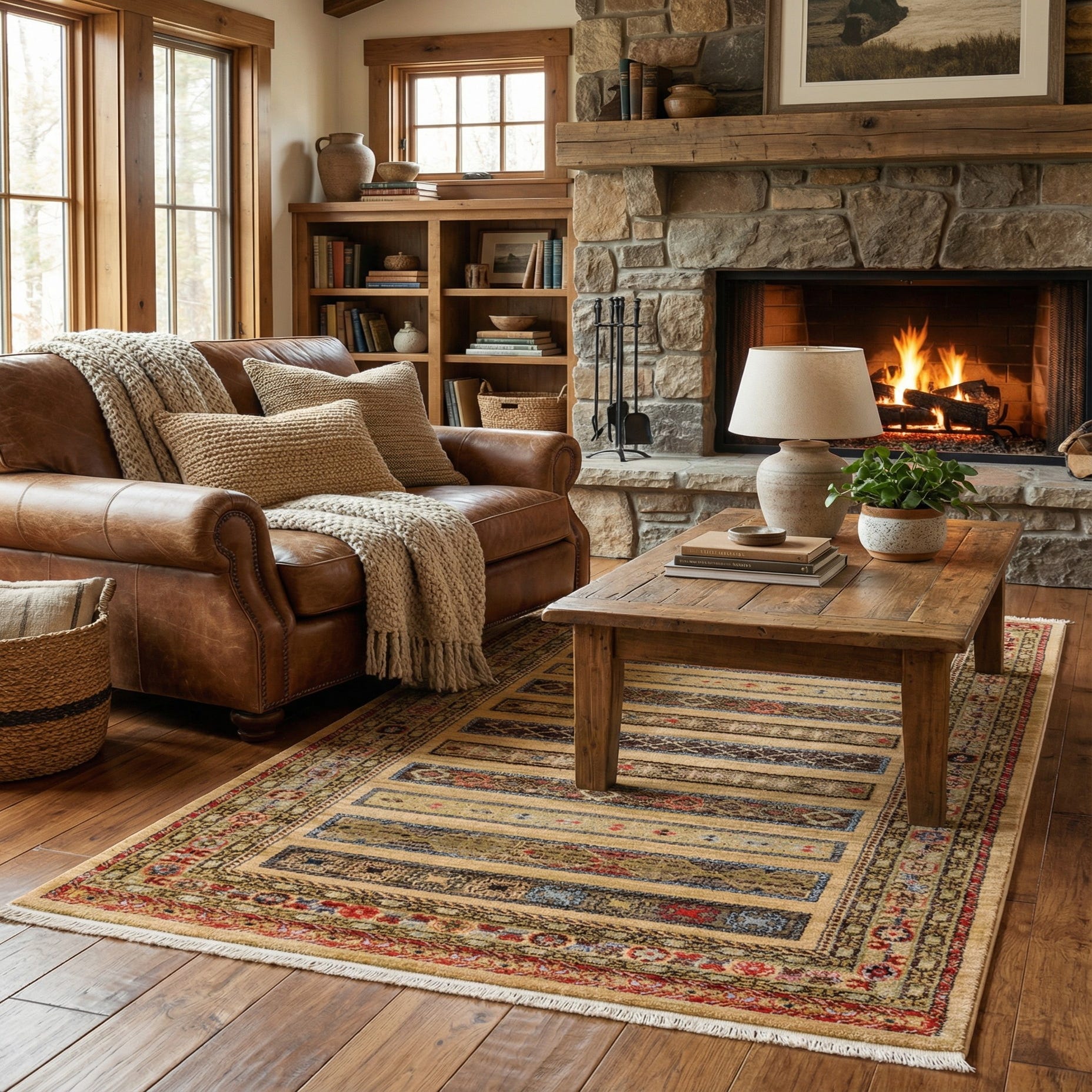 Machine-made of 100% polypropylene, the rug has a low, dense pile with a soft, slightly velvety hand and a gentle sheen that highlights the color contrasts. It’s well suited to smaller seating areas, an entry or hallway, or layered at the foot of a bed. Pair it with warm wood furniture and neutral upholstery to let the patterned bands stand out, or use it to bring coordinated pops of blue and red into a casual, rustic, or transitional room with leather or matte metal accents.