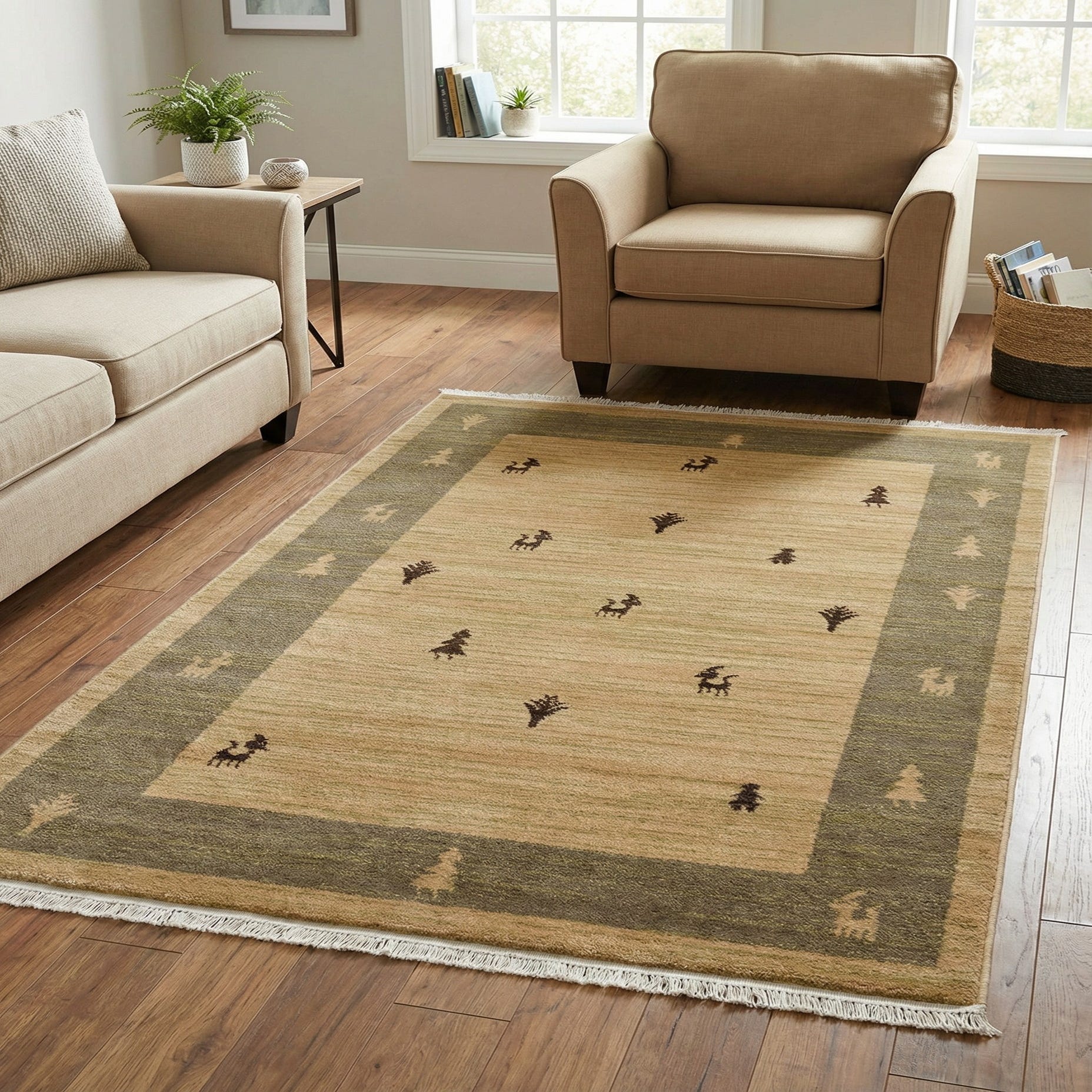 A warm tan field provides the backdrop for a simple, handwoven-inspired layout of small brown animal and tree motifs and modest botanical forms. A narrower brown border frames the center, punctuated with beige silhouettes that add subtle contrast without overwhelming the design. Machine made from 100% polypropylene, the rug has a low-profile pile with a smooth, slightly lustrous hand that feels soft underfoot while holding a tidy, structured surface.