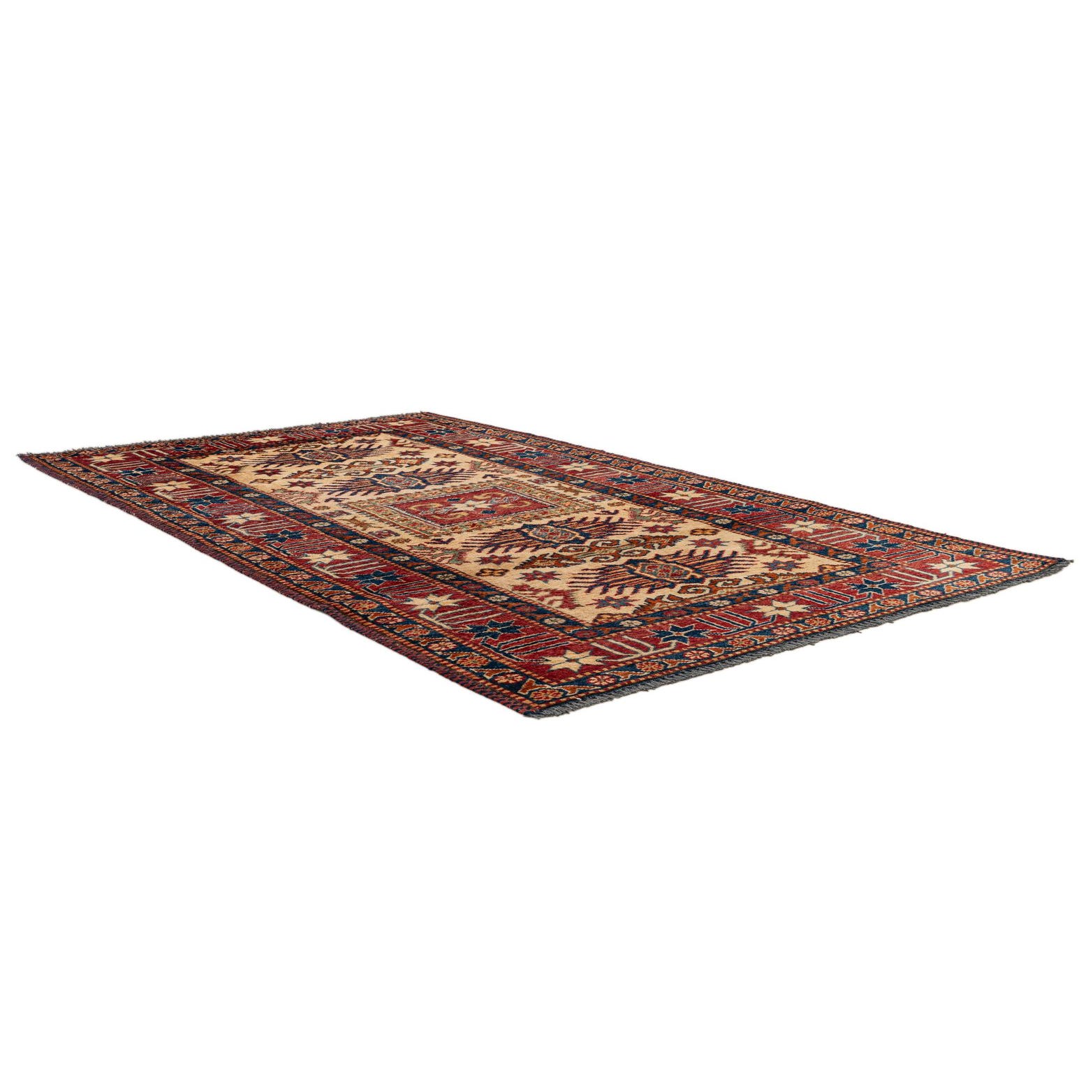 A 3x5 rectangular Rugs.com Kazak rug with a central medallion, featuring intricate oriental patterns in browns, tans, ivories, creams, and deep red and blue accents.
