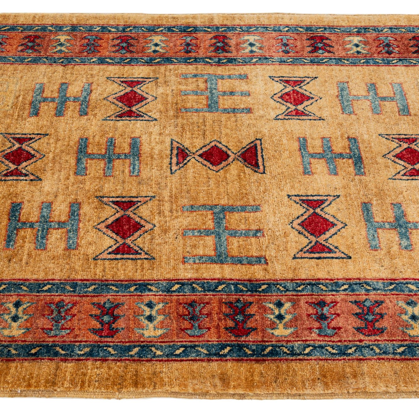 Primary color is Tan. Colors in this rug include: Tan, Beige, Black, Blue, Brown, Peach, Red, Light Blue.