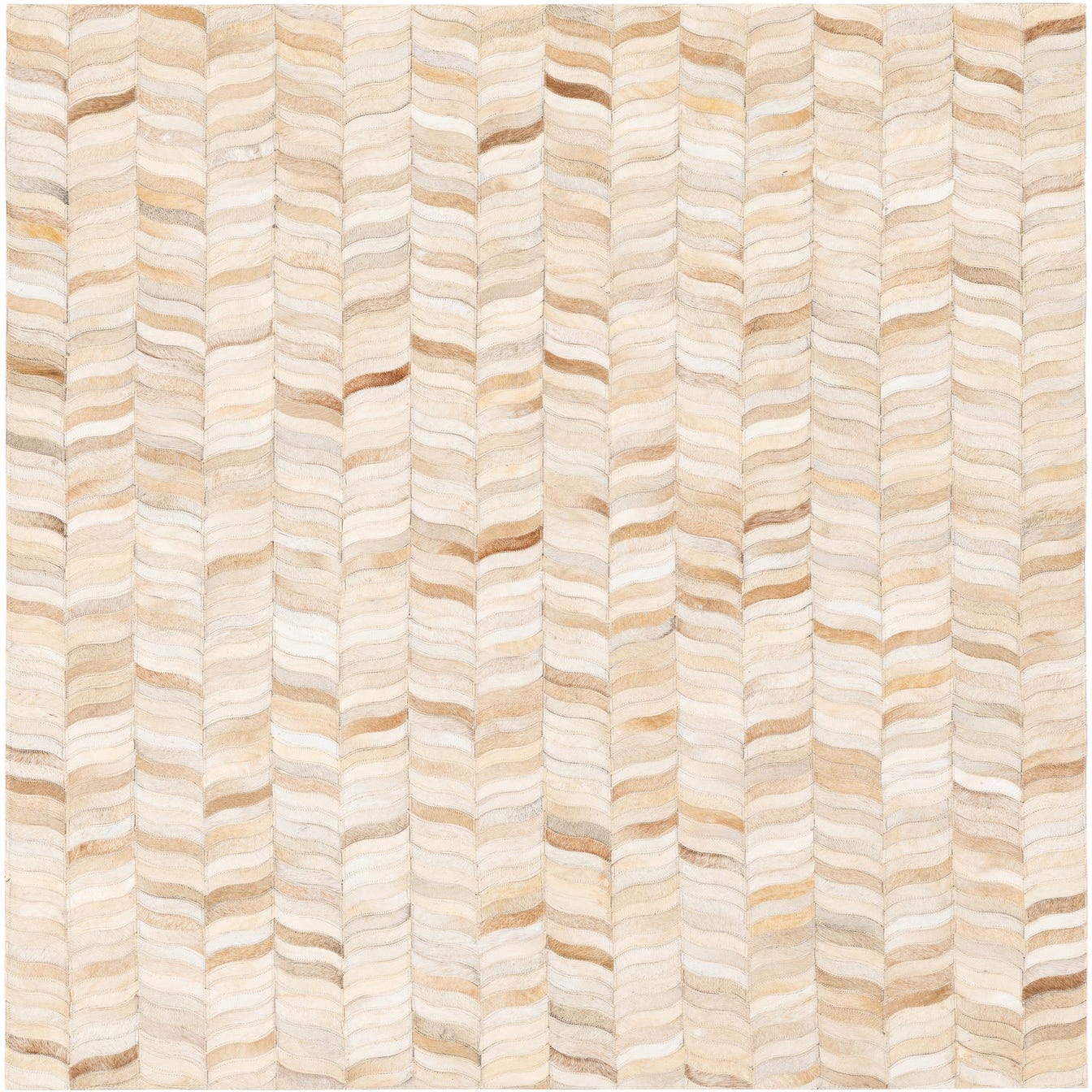 A 4x6 rectangular Cowhide Stocks rug featuring a modern chevron pattern in various shades of brown, tan, and cream.