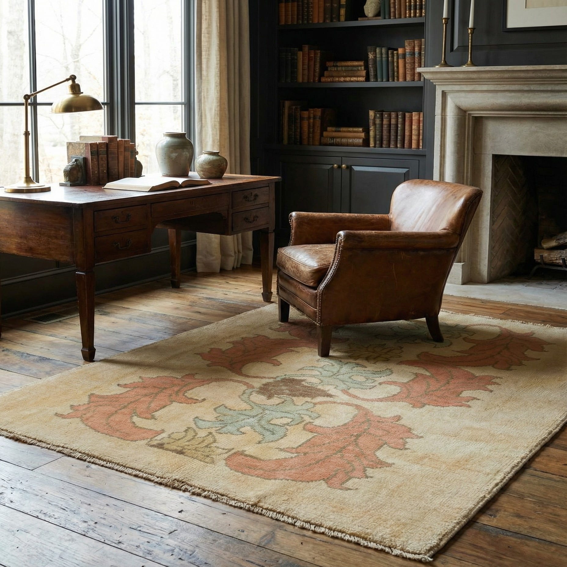 This Oushak collection piece would work particularly well in living rooms, studies, or bedrooms where its warm tones can create an inviting atmosphere, and its artisanal quality can be appreciated up close.