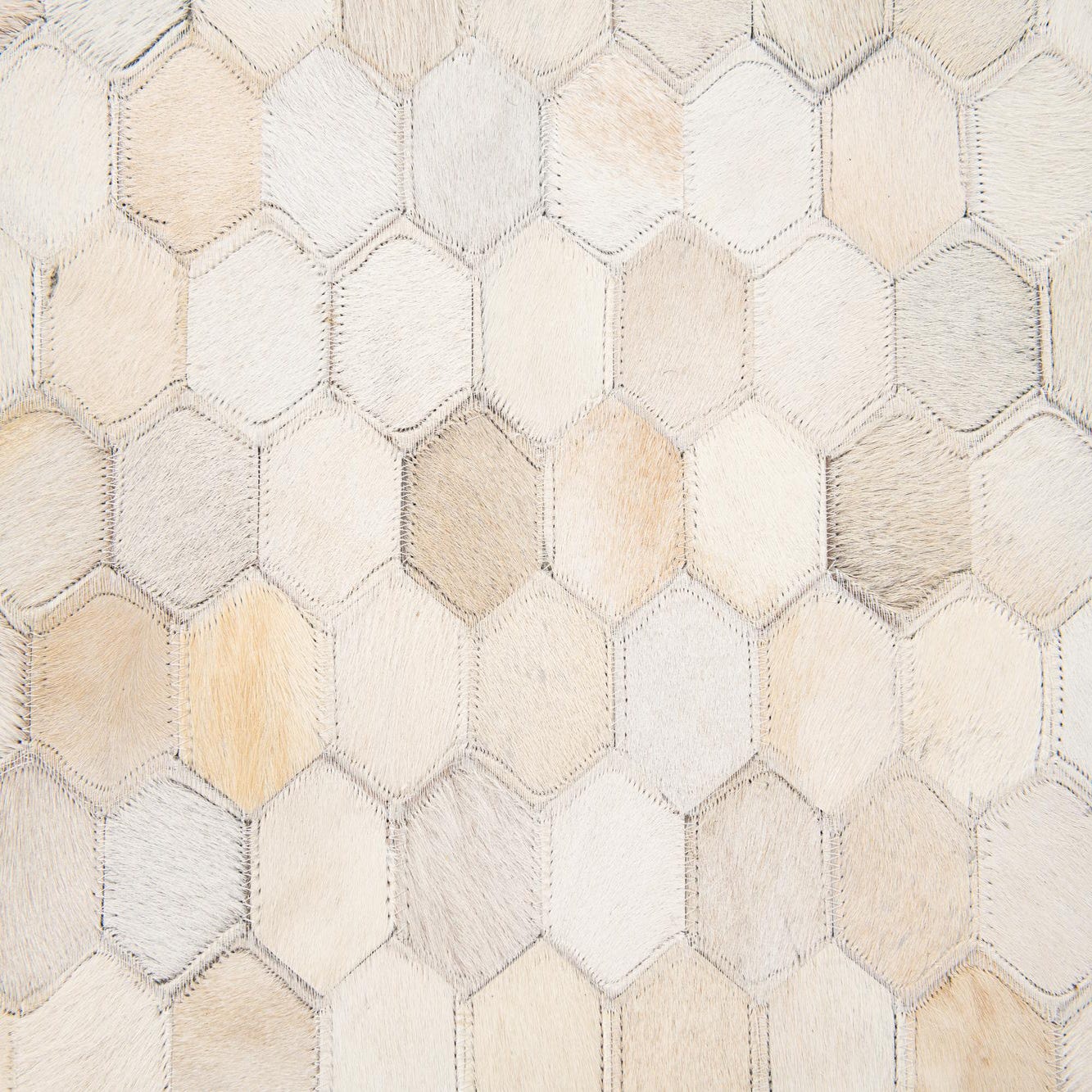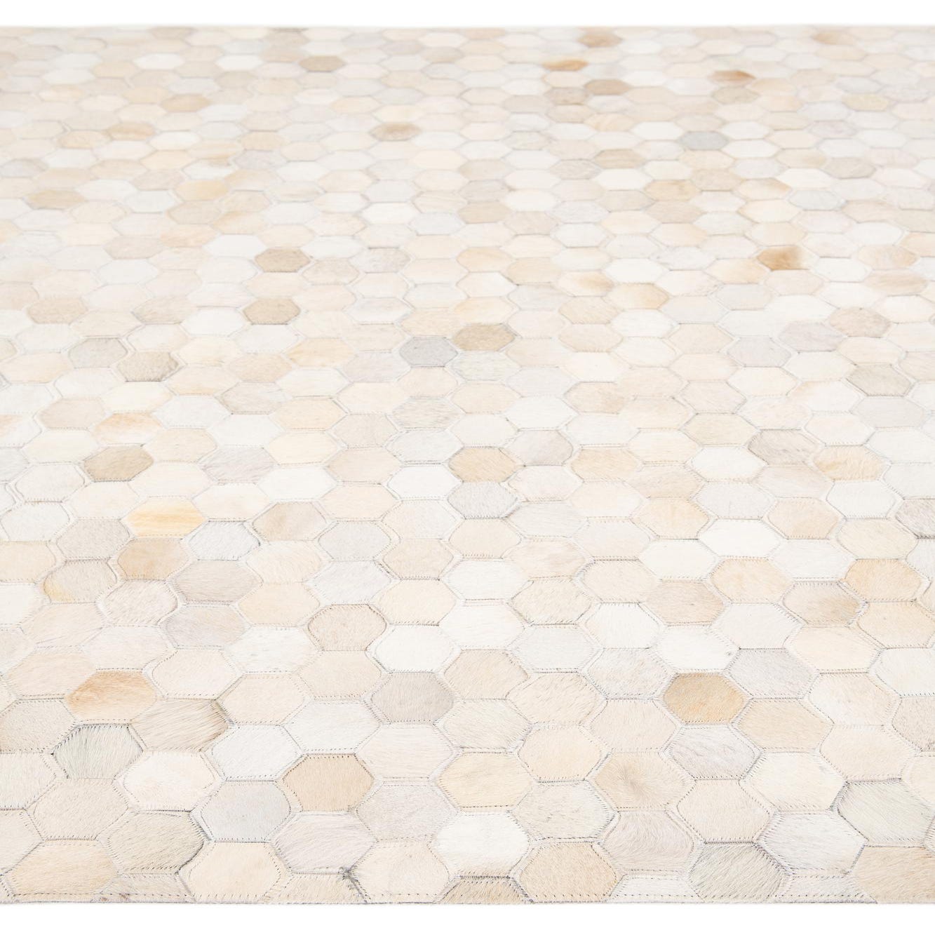 A 5x8 rectangular Cowhide Stocks rug featuring a modern hexagonal mosaic pattern in varying shades of brown, tan, and cream.