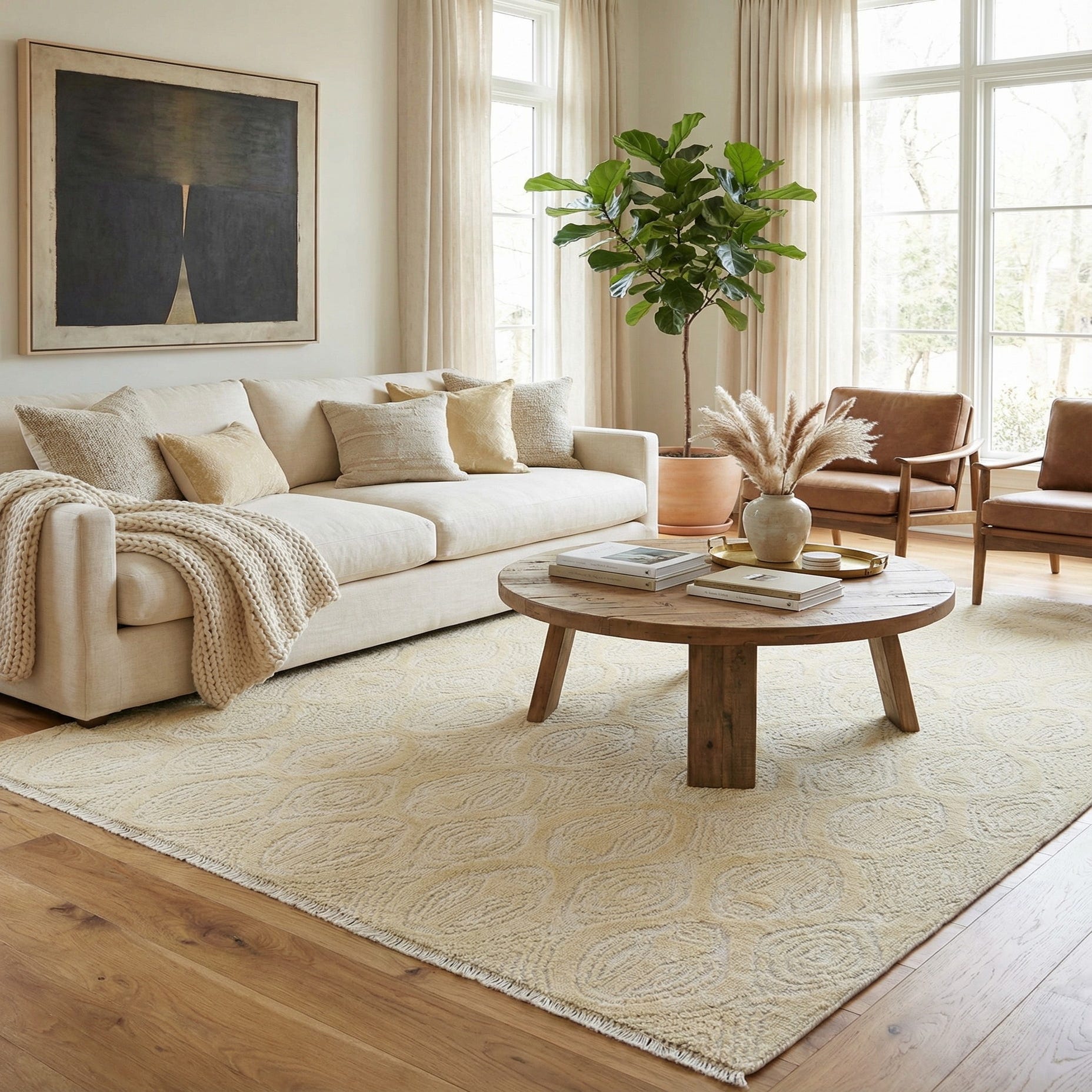 Place this rug under a living room sofa to anchor a neutral seating area, layer it beneath a bed to add softness to a serene bedroom, or run it down a hallway or entry for understated pattern and durable wool construction. It pairs naturally with warm wood tones, linen upholstery and soft metallic accents, and complements transitional, Scandinavian, coastal, or modern farmhouse interiors that favor light, airy palettes.