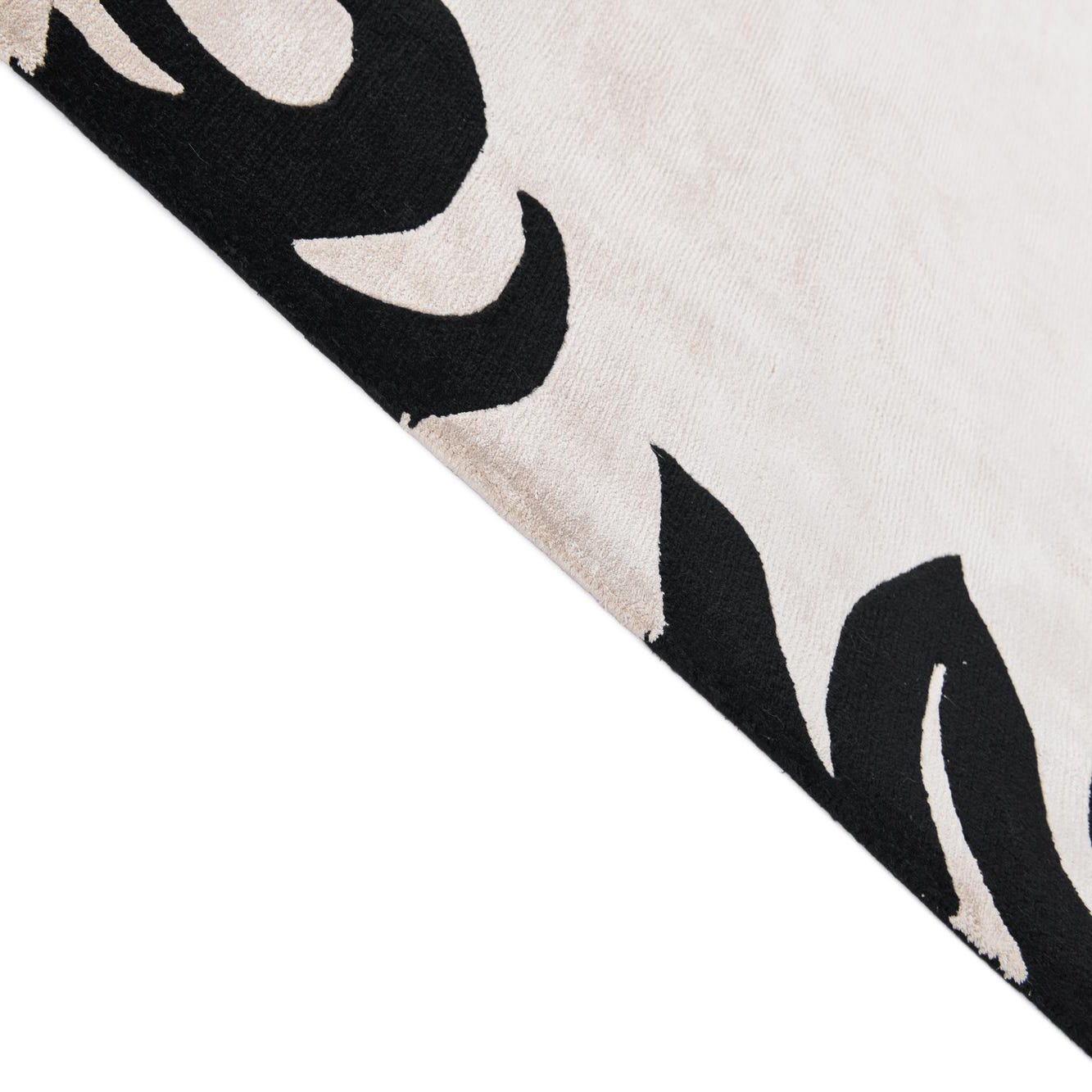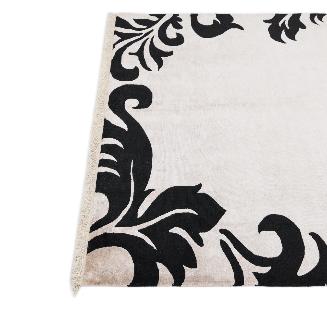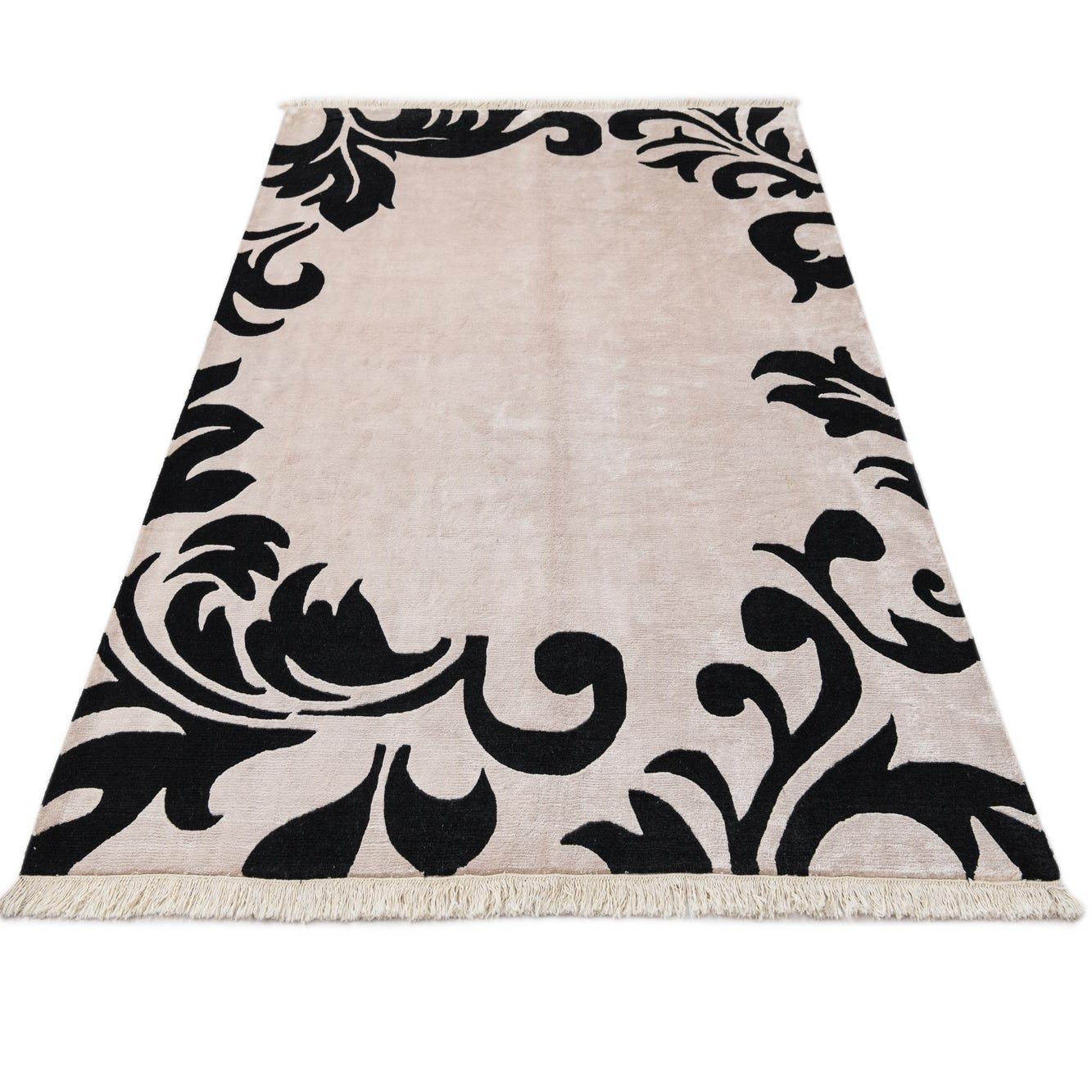 A 5x8 rectangular Darya rug with a cream center and bold black modern oriental floral patterns bordering the edges, featuring fringe.