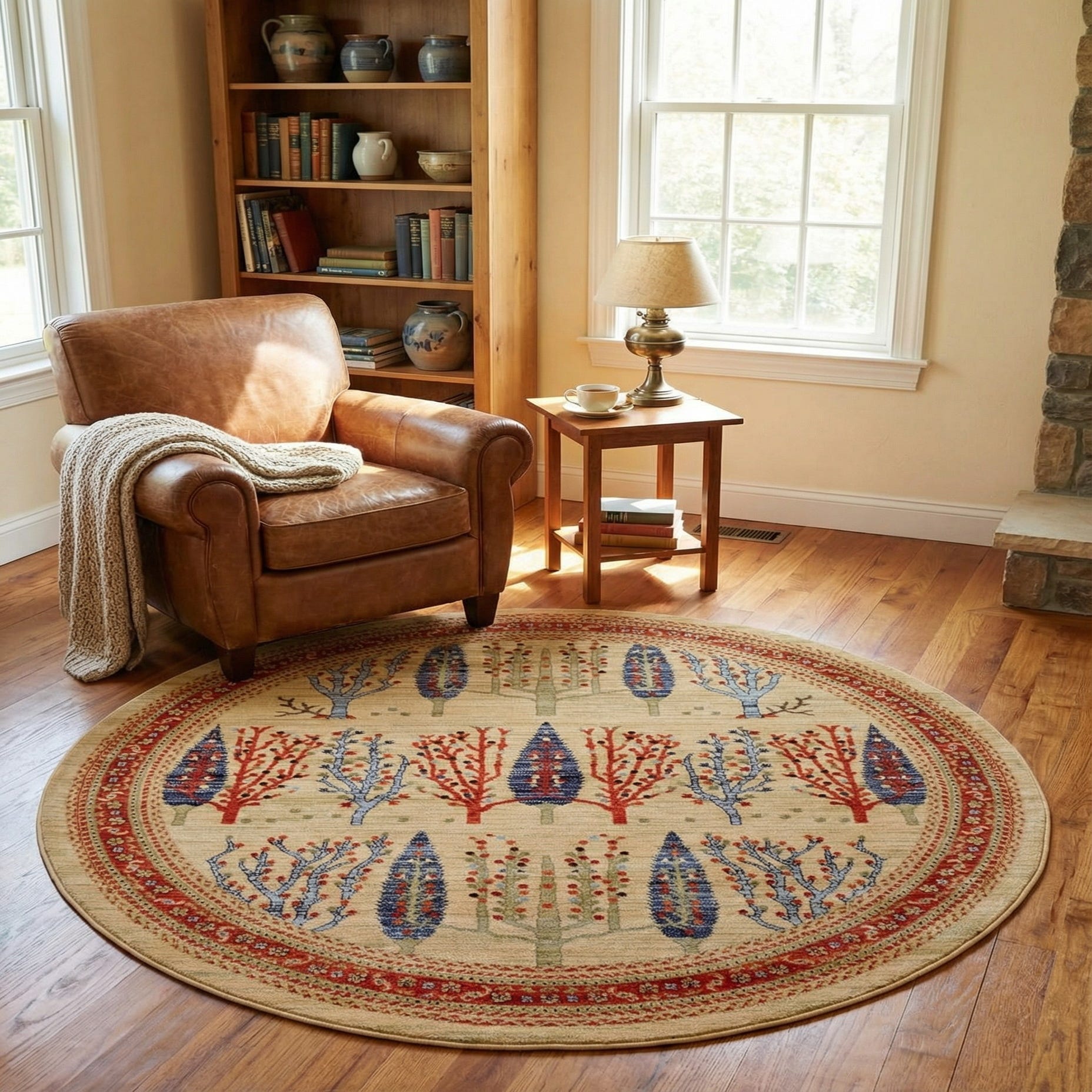 This round rug works well beneath a circular dining table, as a defined seating anchor in a casual living room, or to warm a breakfast nook or reading corner. Pair it with warm woods and leather, navy or olive throw pillows, or terracotta accents for a cohesive palette; the pattern also complements transitional, cottage, or global-inspired interiors. Its compact shape and friendly color mix make it an easy way to introduce layered pattern and subtle color without overpowering a space.