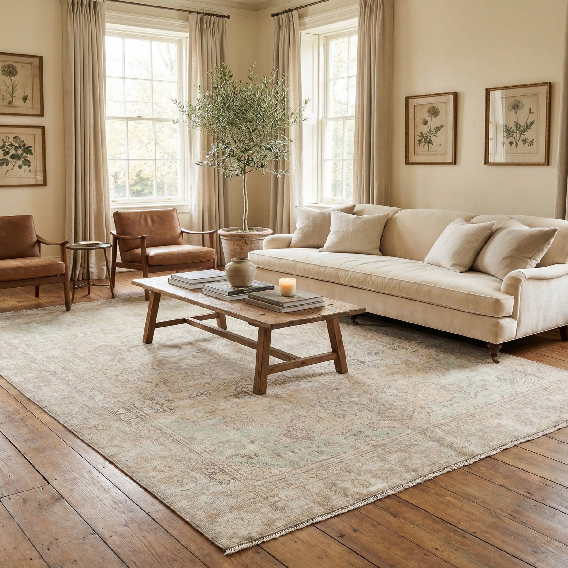 A 6x9 rectangular Ultra Vintage rug in muted browns, tans, and creams with a faded Persian medallion pattern, suitable for a living room.