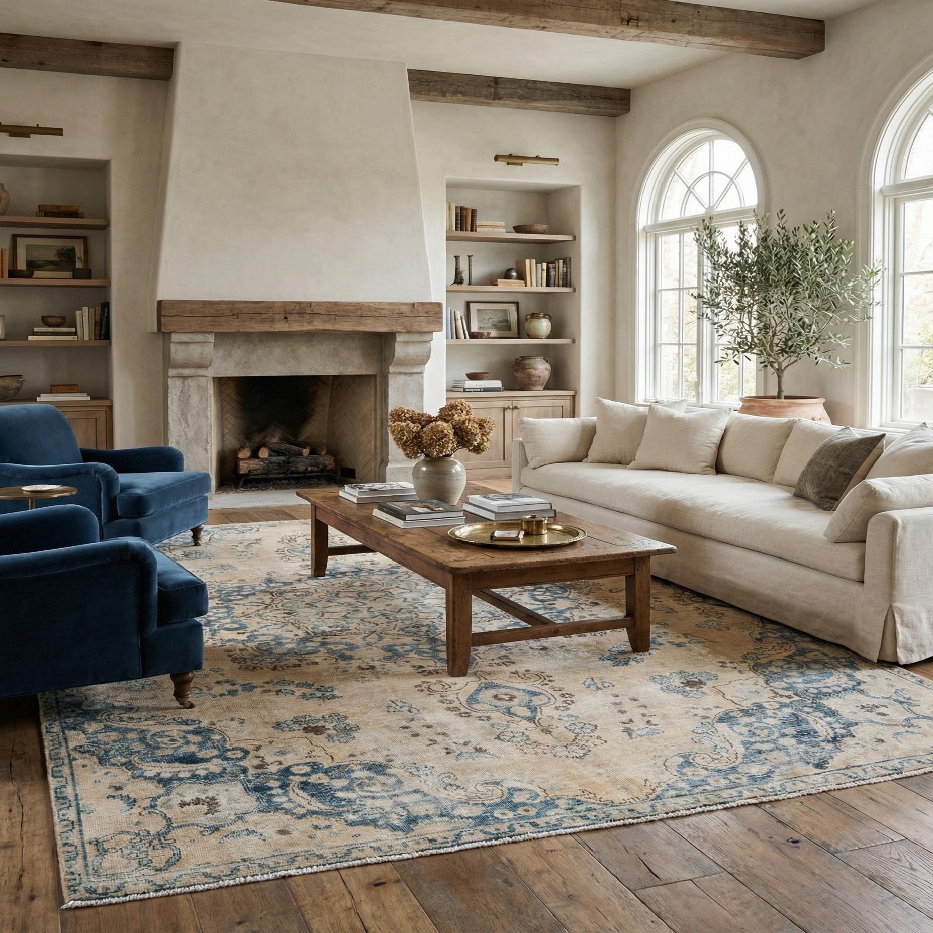 Primary color is Tan. Colors in this rug include: Tan, Brown, Navy Blue, Light Blue, Ivory.
