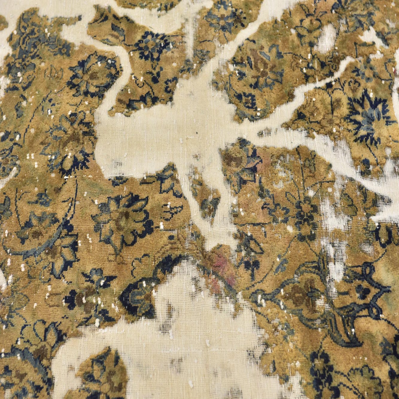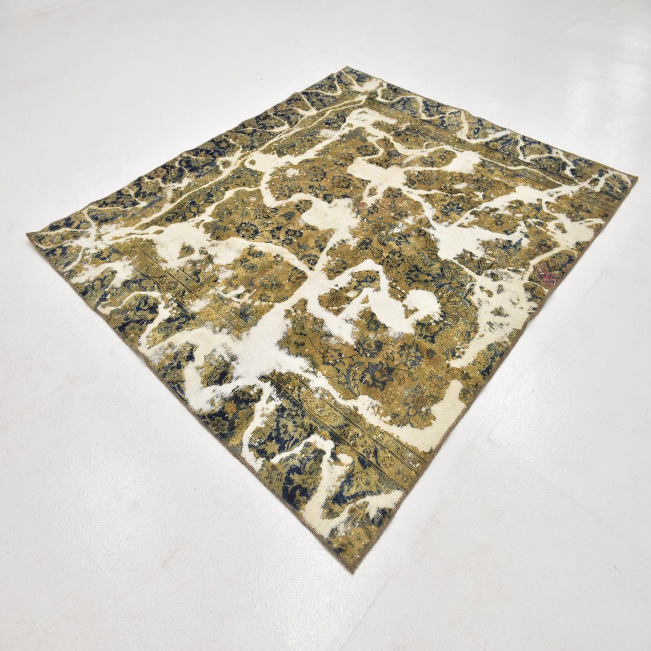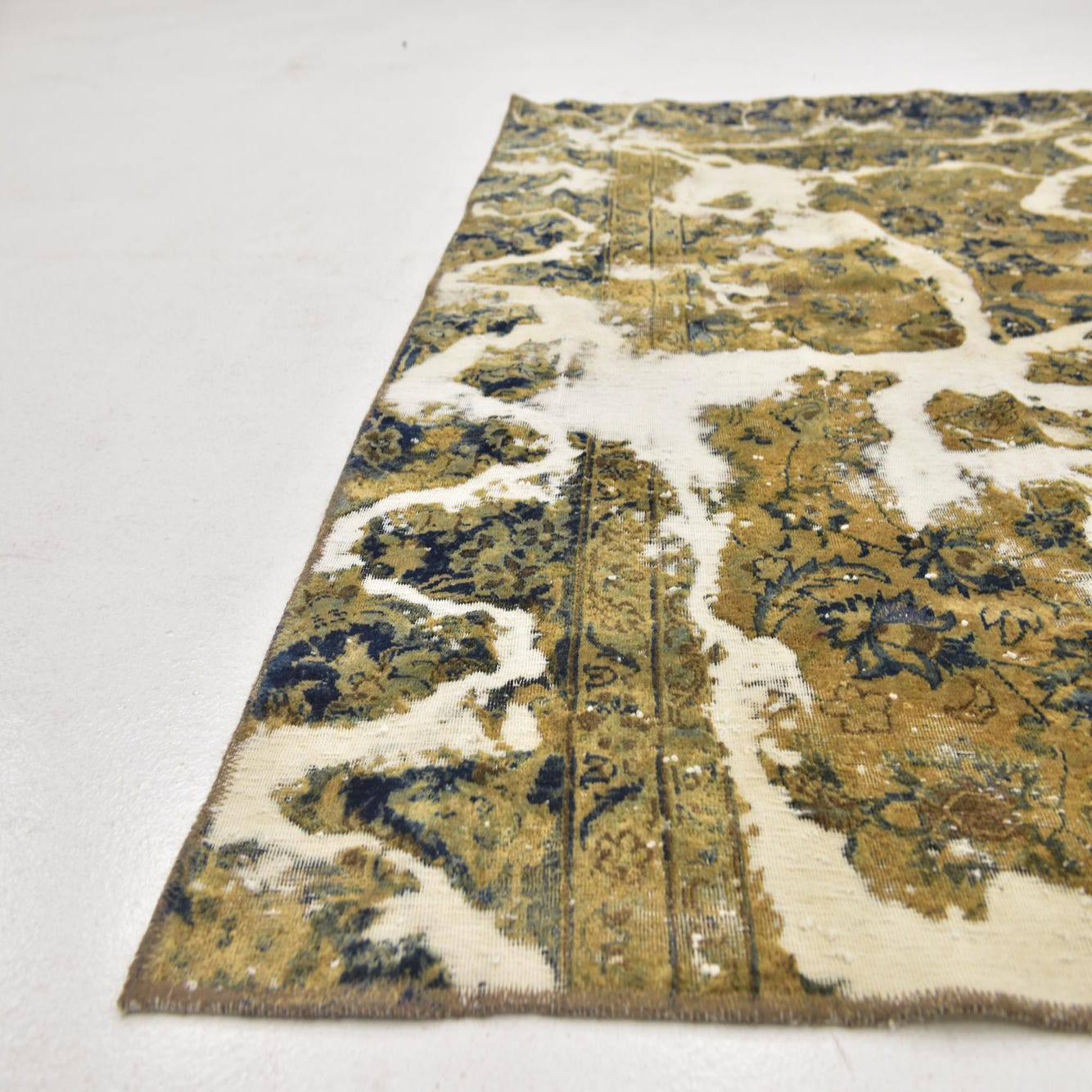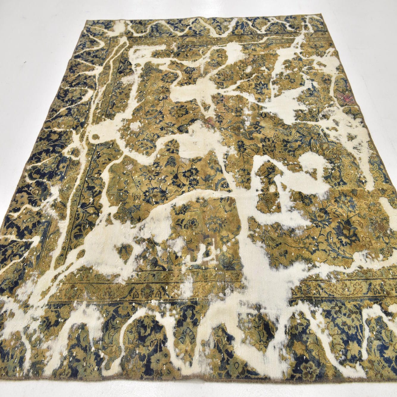 This Persian Ultra Vintage rug is an antique Persian Rug that has been washed, over-dyed, and then shaved down to a low pile. Look at the detail pictures to fully appreciate the uniqueness of this piece.