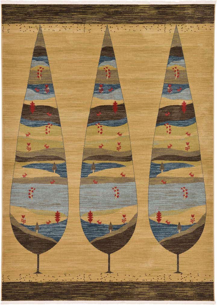 Primary color is Tan. Colors in this rug include: Tan, Beige, Brown, Blue, Red, Light Blue.