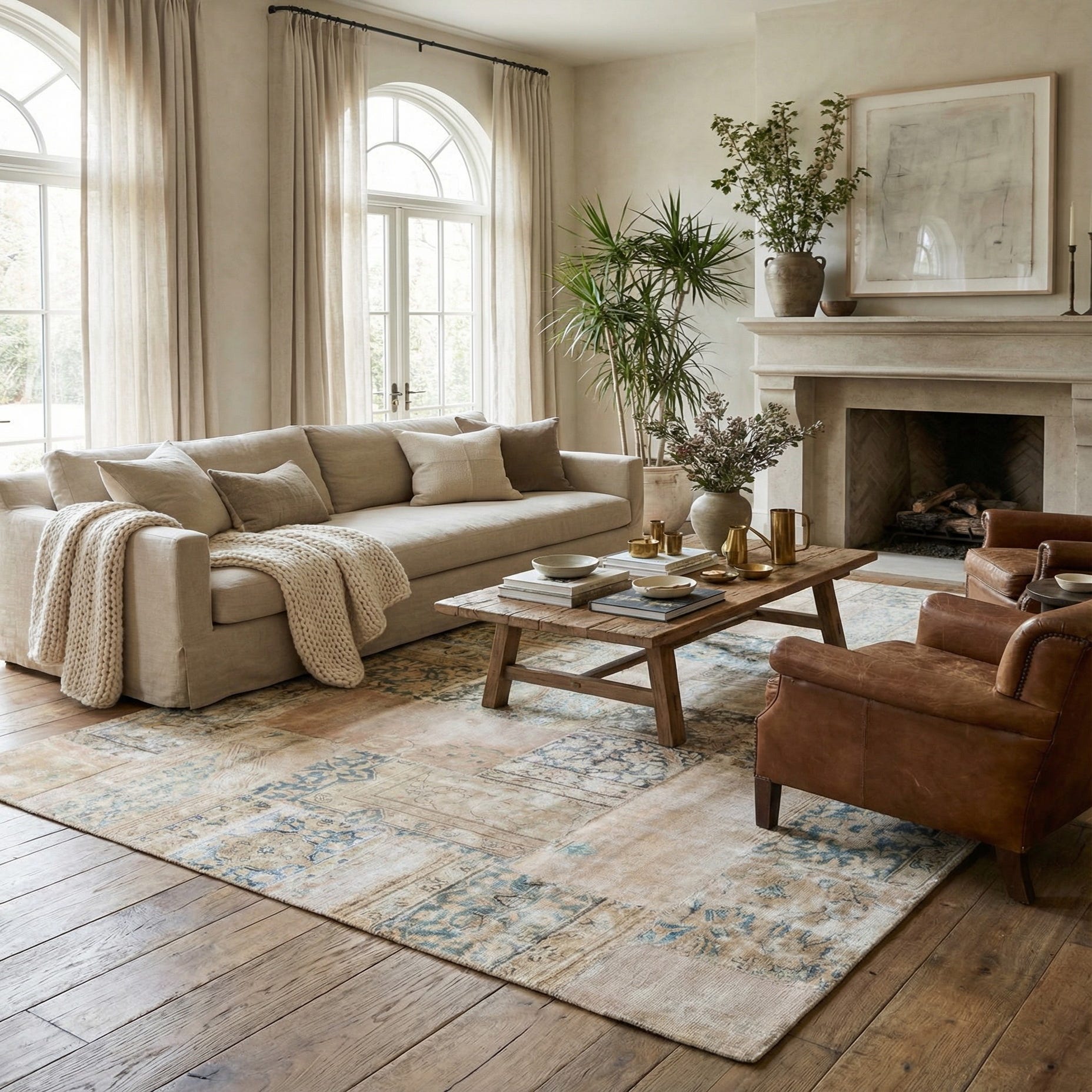 The background color is a warm, neutral tan, providing a versatile base that allows the other hues to stand out. Accent colors include shades of brown, blue, ivory, and beige, which come together to create a soft, yet visually rich tapestry. The thoughtful use of color balances the rug's vintage appeal with contemporary sensibilities.