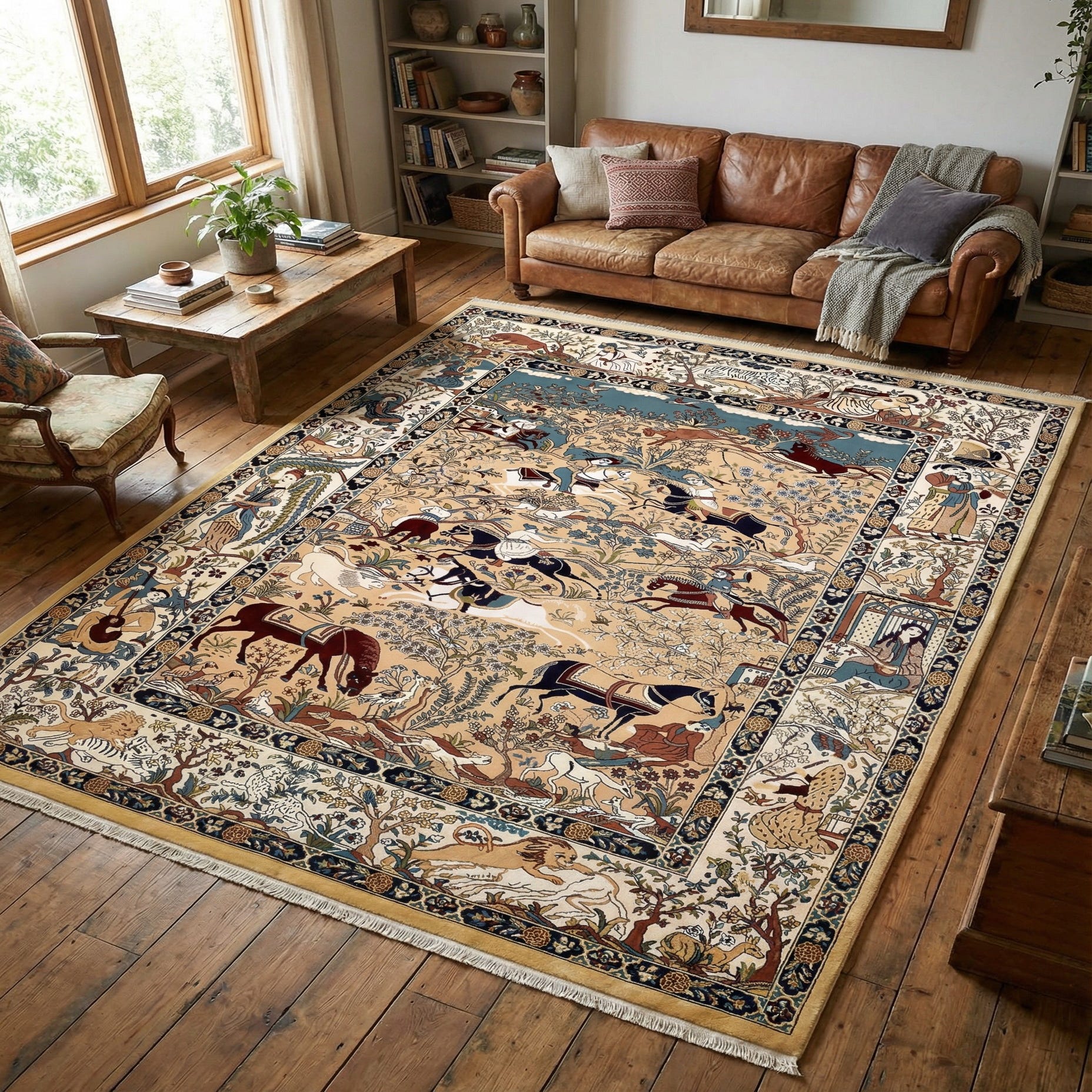 A detailed pictorial field unfolds across a warm tan ground, depicting a lively hunting-scene of galloping horses, hounds, birds and stylized trees woven into a classic Persian-inspired layout. Rich navy blue and cream bands frame the center while burgundy and plum red accents and touches of green bring depth to the floral and foliate motifs. Soft blue and ivory highlights lift the composition, and the overall effect is a balanced mix of ornate patterning and traditional colorways.