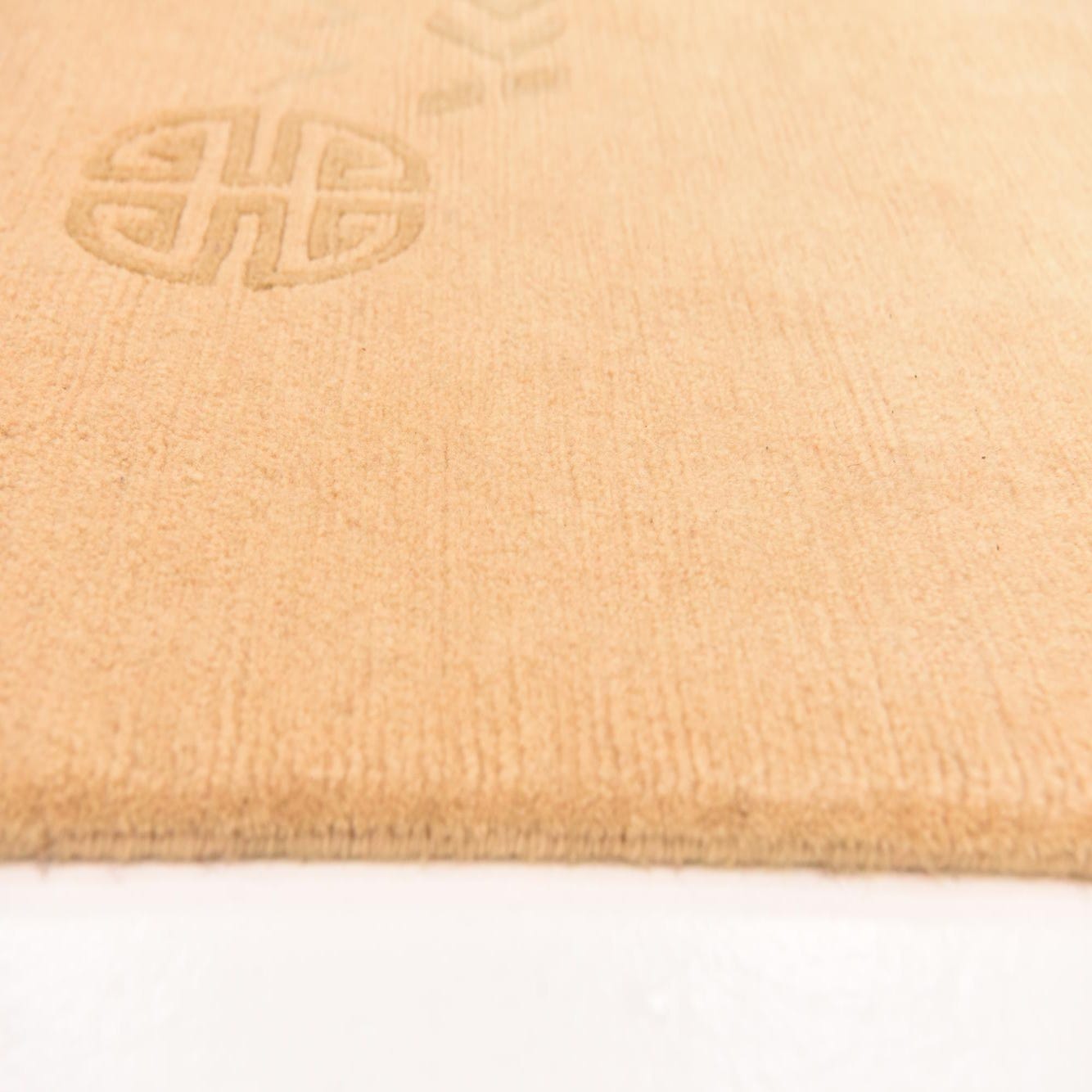 This Nepal collection rug is a Hand Knotted piece, measuring 8x10, crafted from 100% wool, offering a durable and delightfully tactile experience underfoot. The rug presents a subtly varied tan background with understated patterns rendered in shades of beige and light brown, contributing to a sense of serene elegance. The design features geometric motifs and tribal symbols that are tastefully distributed across the rug, allowing it to complement minimalist and contemporary decor as equally as it would a more traditional or eclectic setting. The addition of fringe on the edges provides a classic touch, emphasizing the rug's handcrafted quality. Ideal for anchoring living spaces, this rug can serve as a refined foundation in a subdued color palette or as a harmonizing element in a room layered with natural materials and textures.