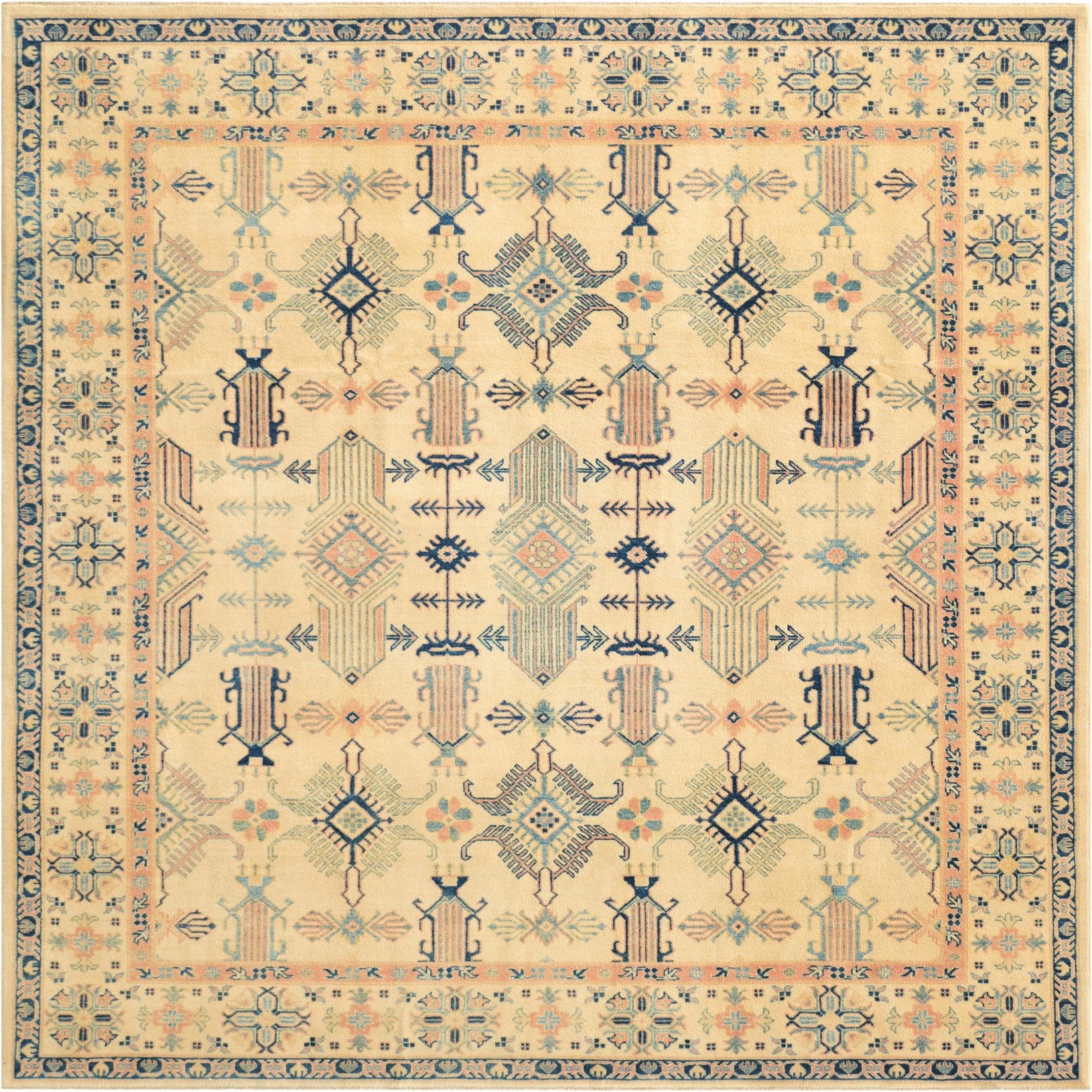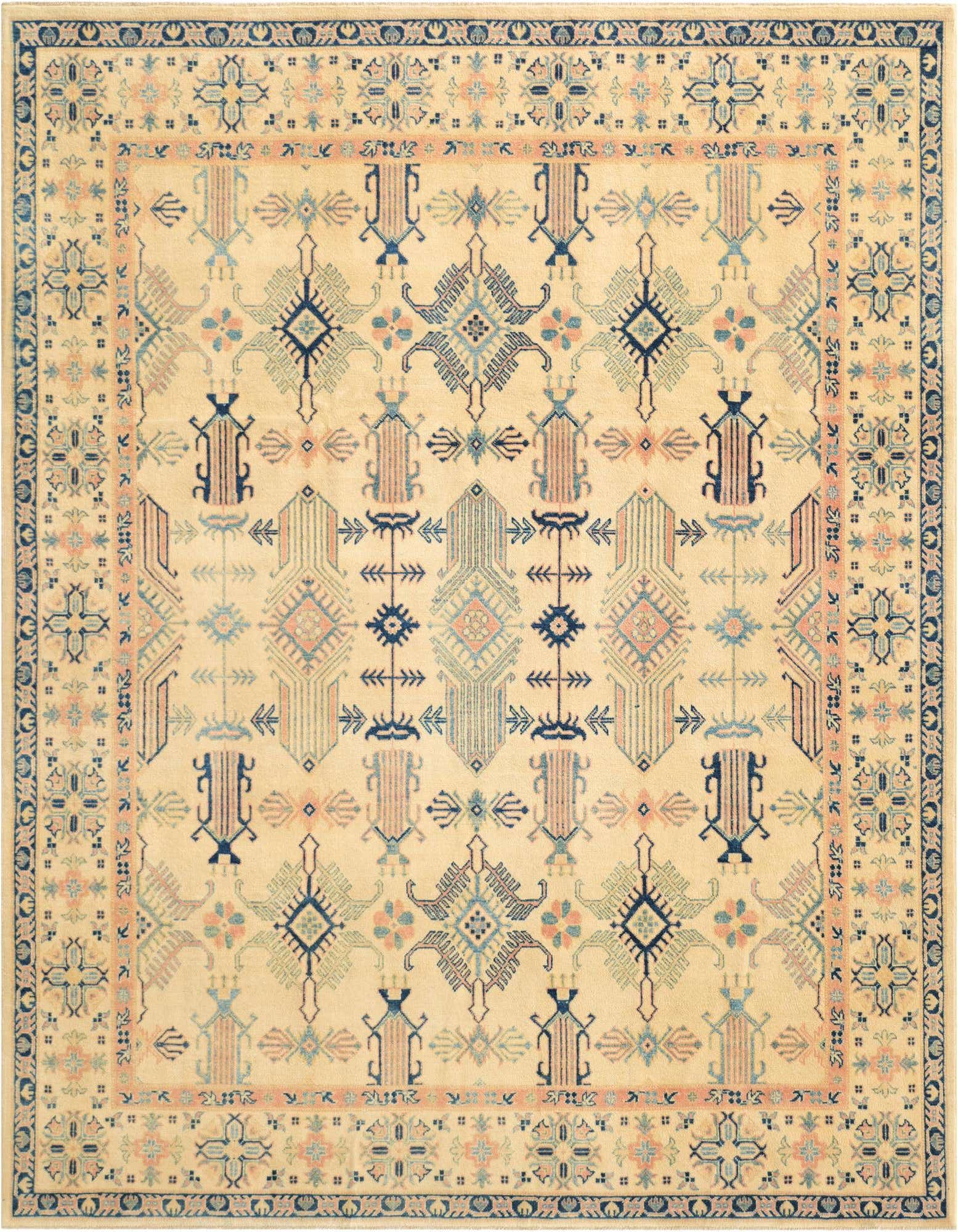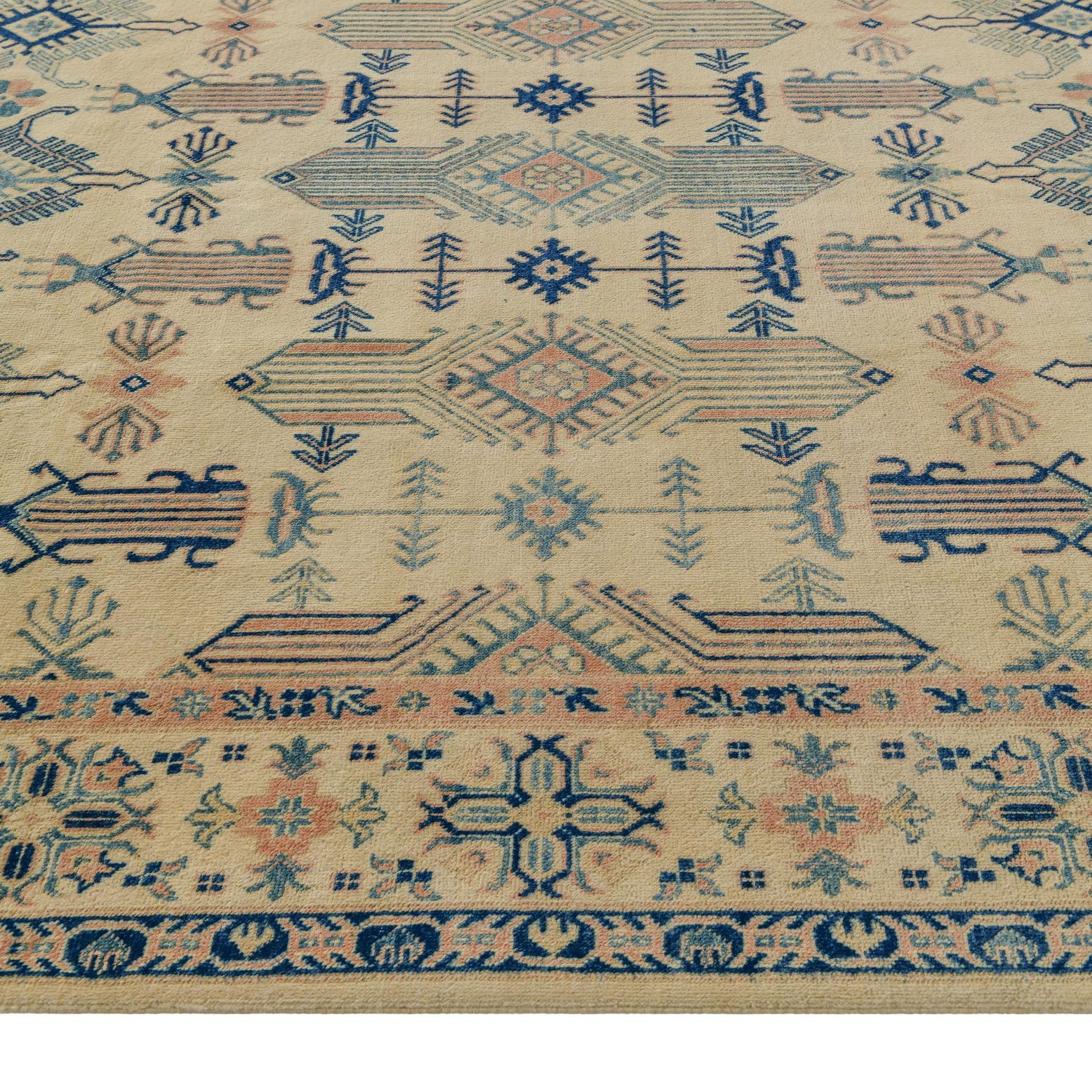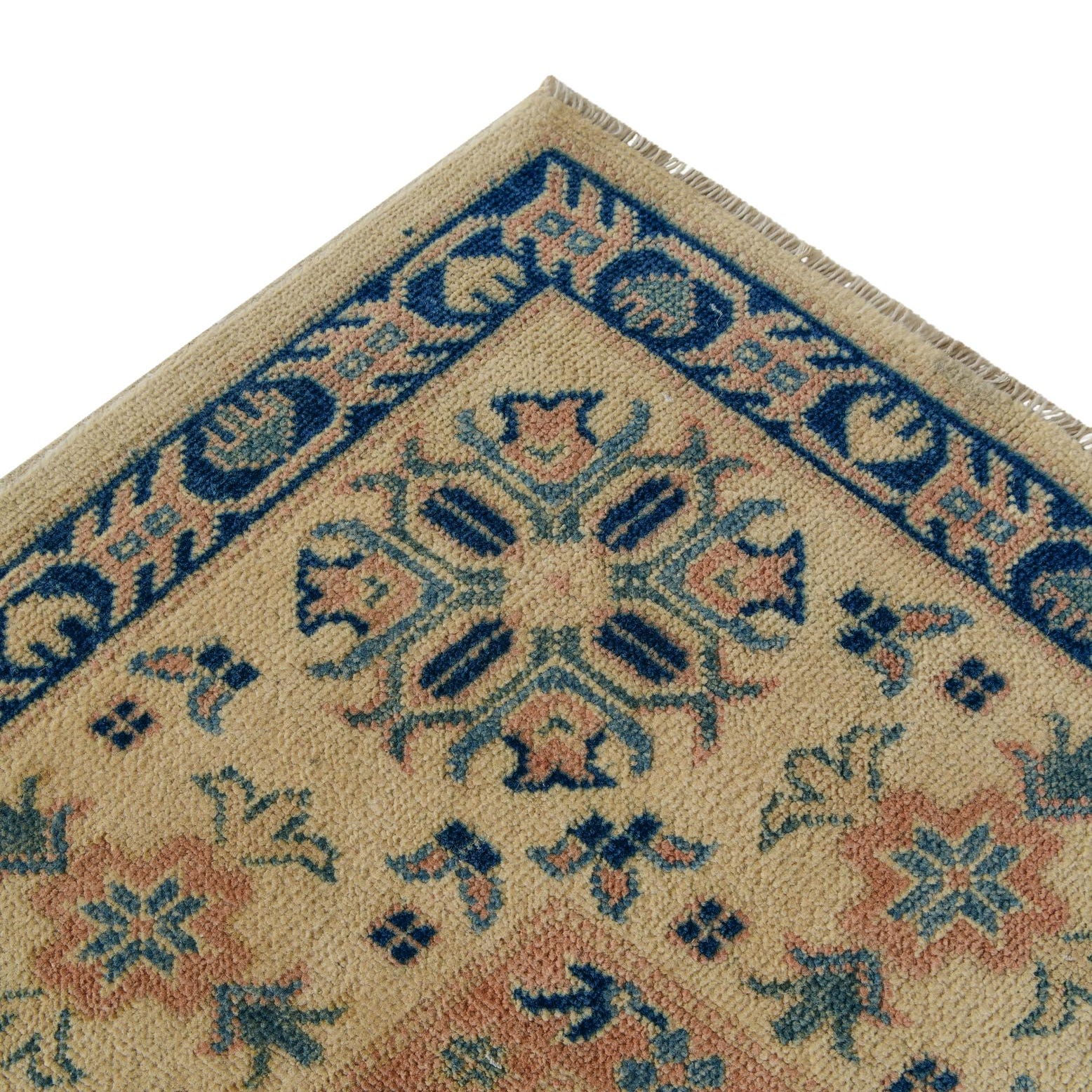 Primary color is Tan. Colors in this rug include: Tan, Navy Blue, Peach, Light Blue.
