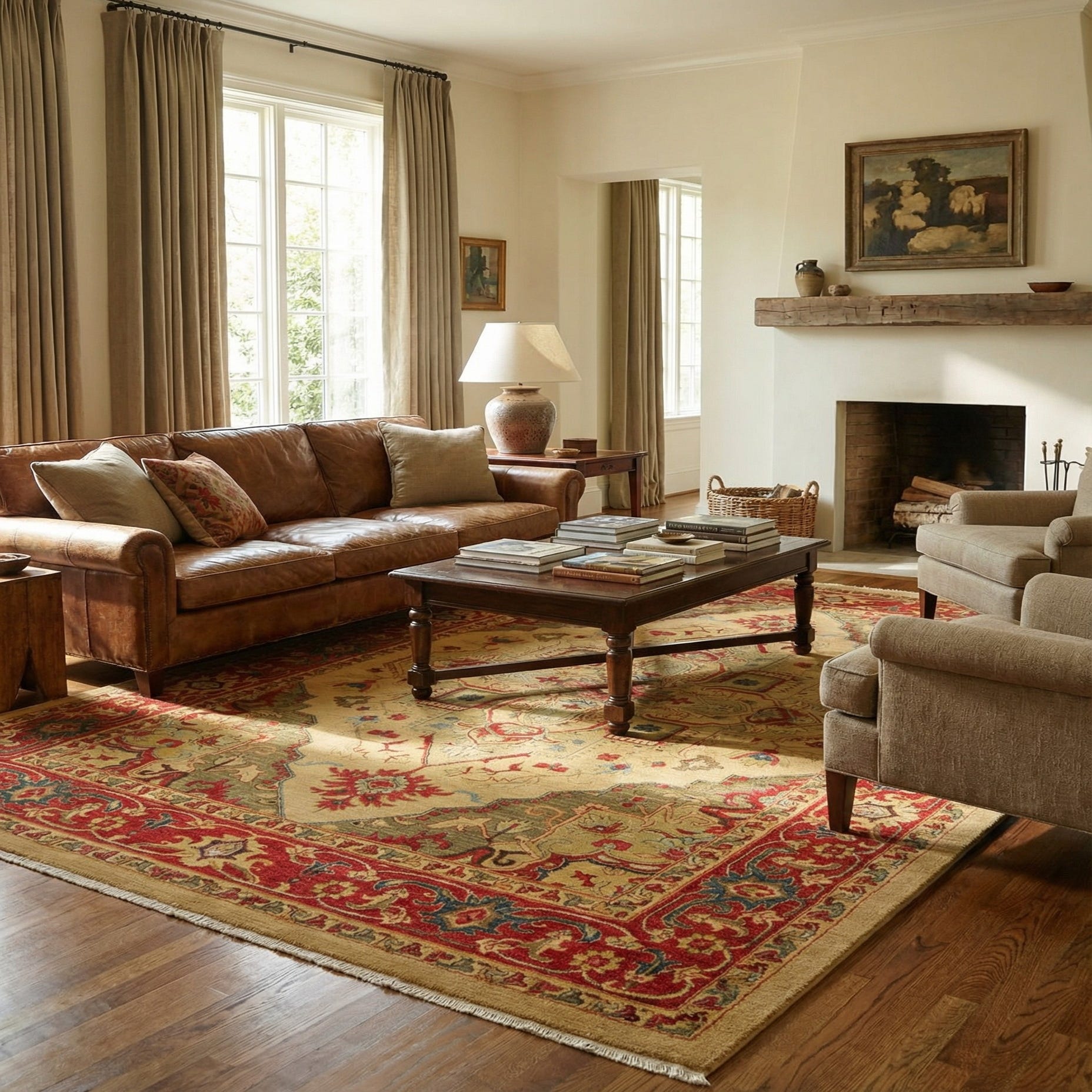 A classic medallion layout rests on a warm tan field, with an ornate central motif worked in light brown and light green and accented by pops of red, navy blue and light blue. A rich red border frames the composition with scrolling floral vines and smaller guard borders, while corner spandrels in brown and green add depth and traditional symmetry. The layered motifs and restrained palette give the rug a timeless, heritage feel that balances warmth and color without overwhelming a room.