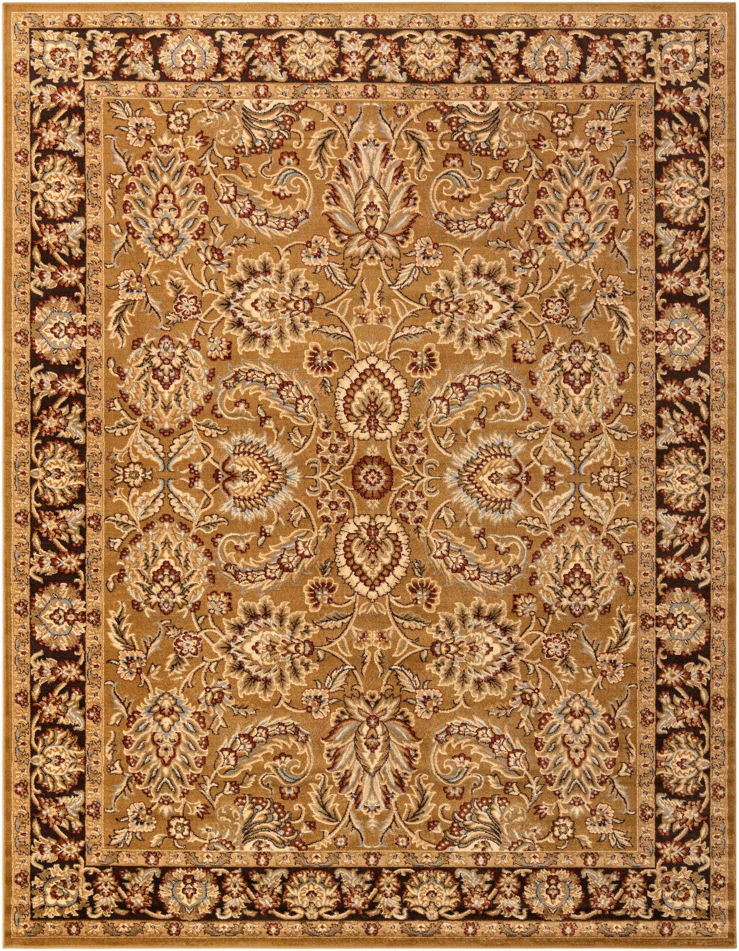 This area rug would be a perfect fit within various interior spaces. It could complement a formal living room or dining room with its classic aesthetic or add a touch of refinement to a more relaxed family room setting. Its warm tan hue and decorative patterning could easily tie together wood furniture and leather accents in a study room or office, as well as provide a comforting underfoot in a master bedroom with a traditional decor theme.