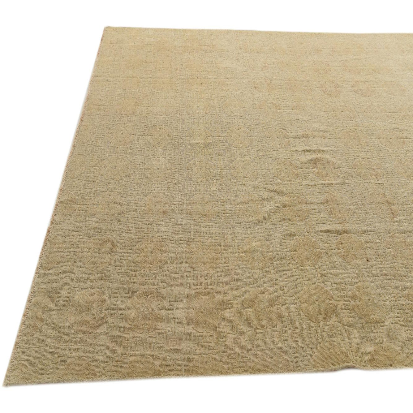 The Darya collection presents a refined 9x12 hand-knotted rug crafted from 100% wool, offering both durability and a soft texture. This rug features a tan background with subtle ivory accents forming an understated pattern throughout the piece, providing a tranquil aesthetic that complements its plush feel.