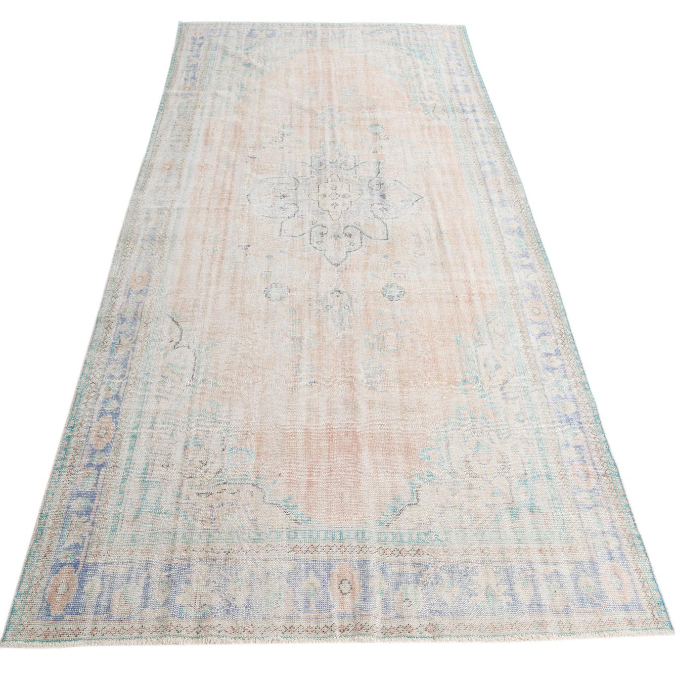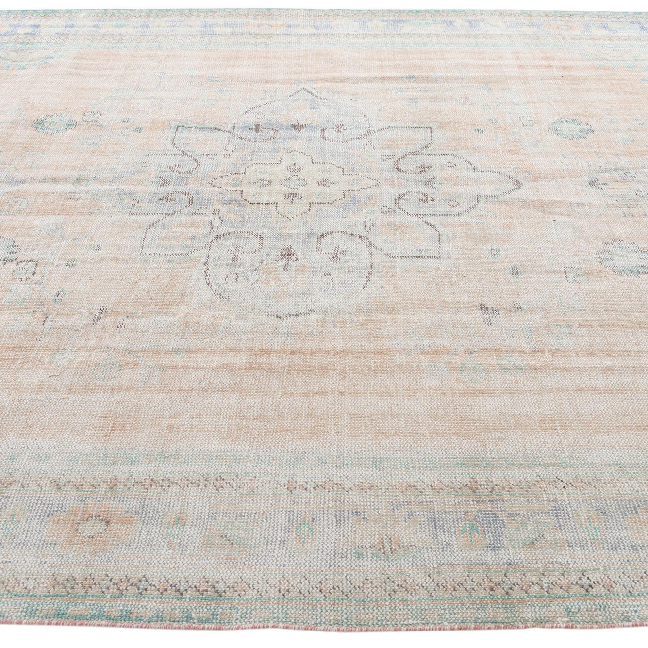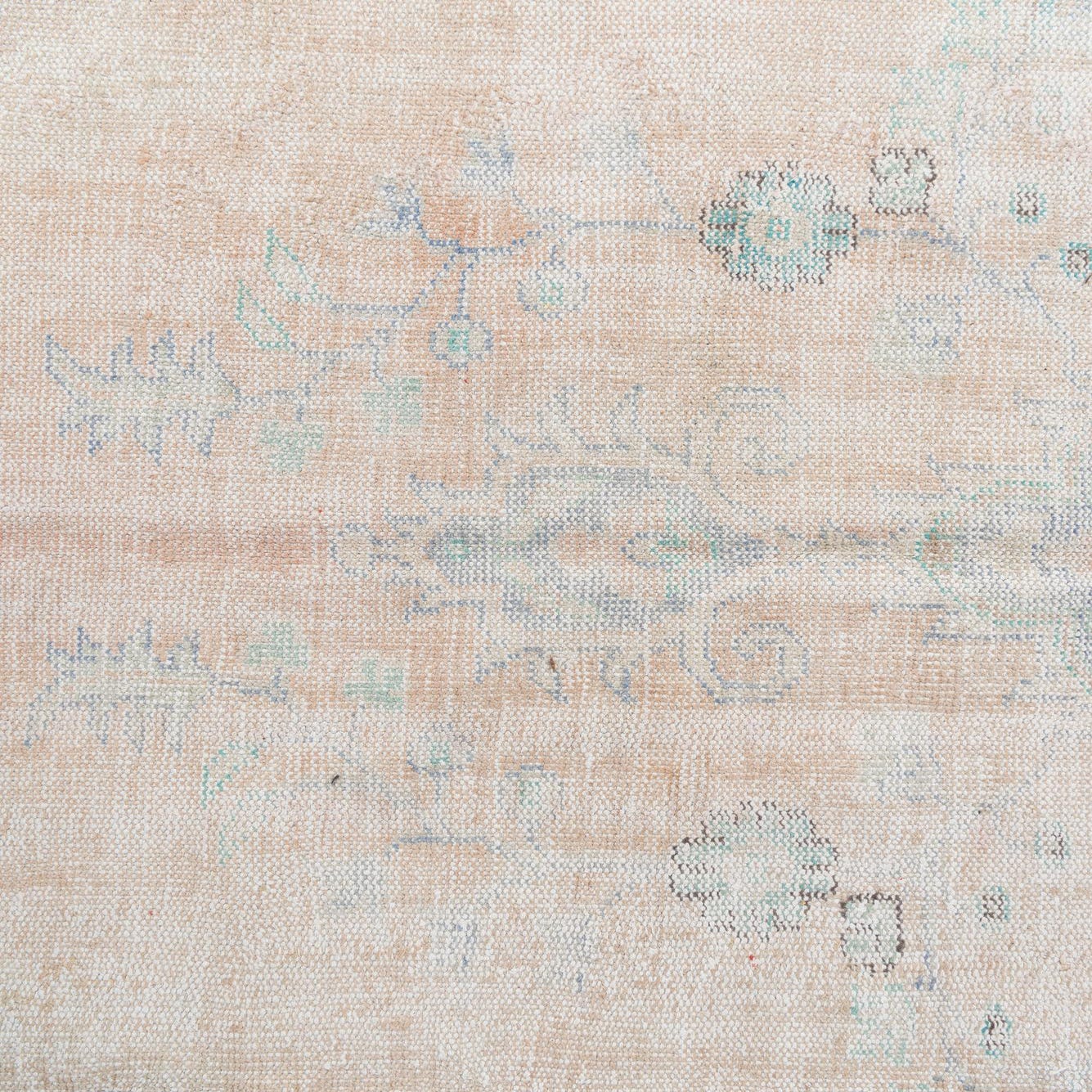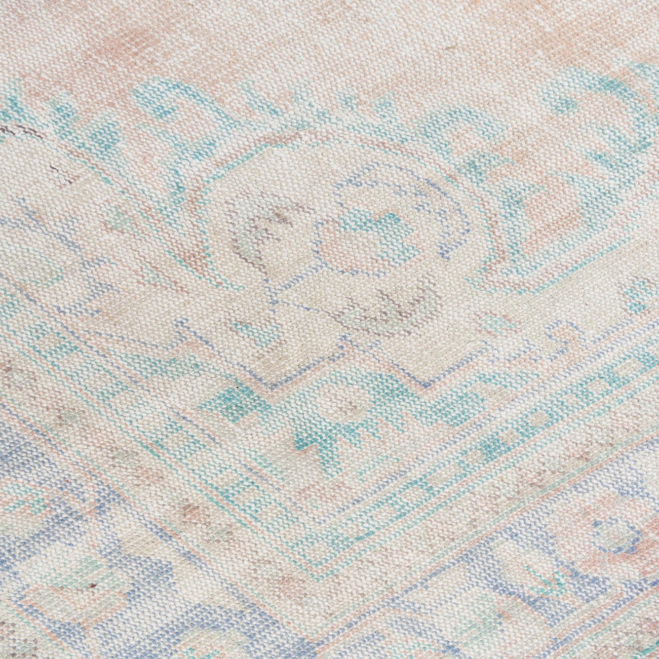 At 9x12 feet, the size of the rug makes it a substantial statement piece for spacious living areas, dining rooms, or large bedrooms. Its pattern—characterized by intricate border details and a central medallion—is softened by the gentle fading of colors, which imparts a sense of history and sophistication.