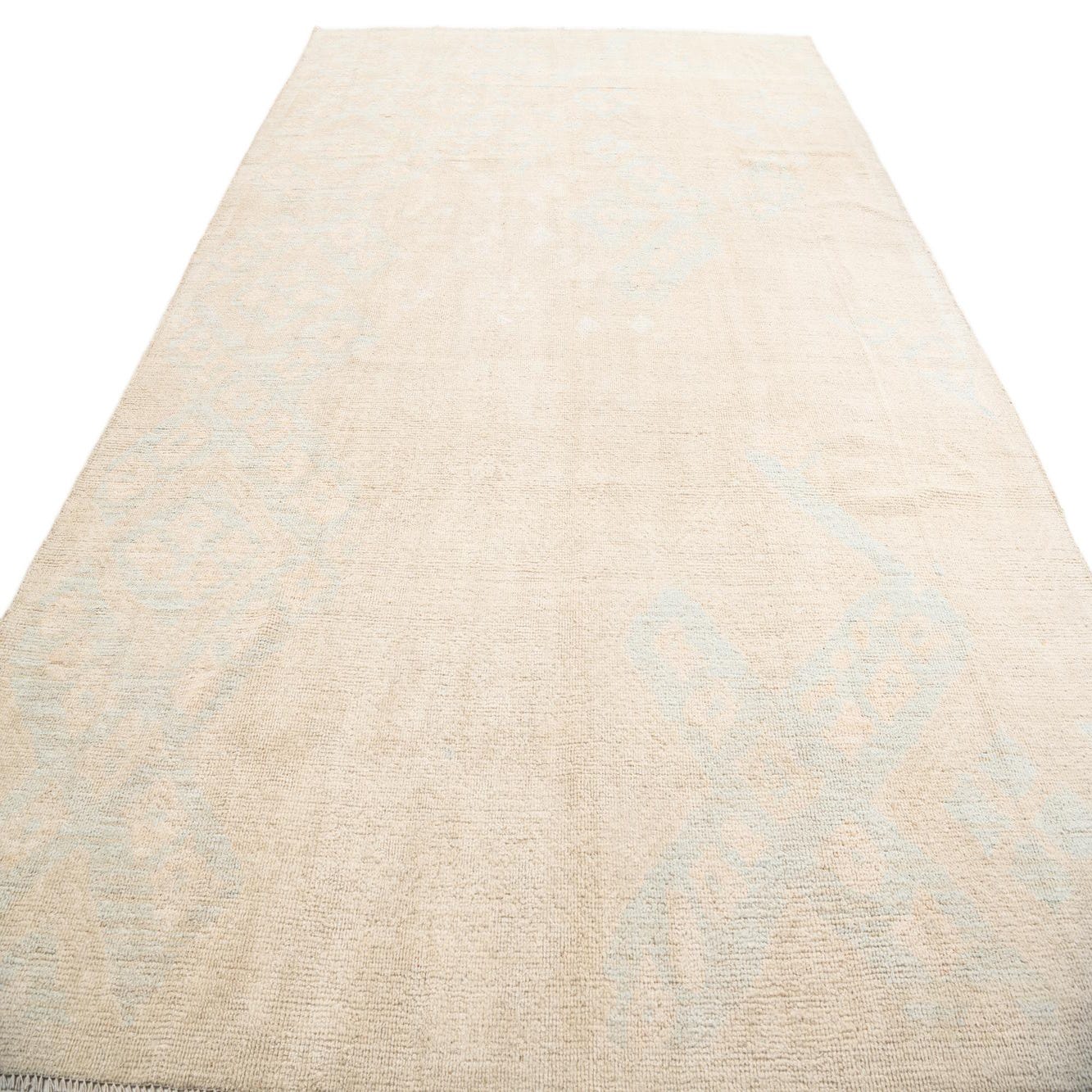 A soft tan field provides a warm, neutral backdrop for a quietly patterned design in ivory and light blue. Large medallion and diamond motifs are rendered in low-contrast tones, creating a gently faded, vintage-inspired look that adds depth without drawing too much attention. The light-blue accents thread through the ivory detailing, giving the rug a cool counterpoint to the tan ground.