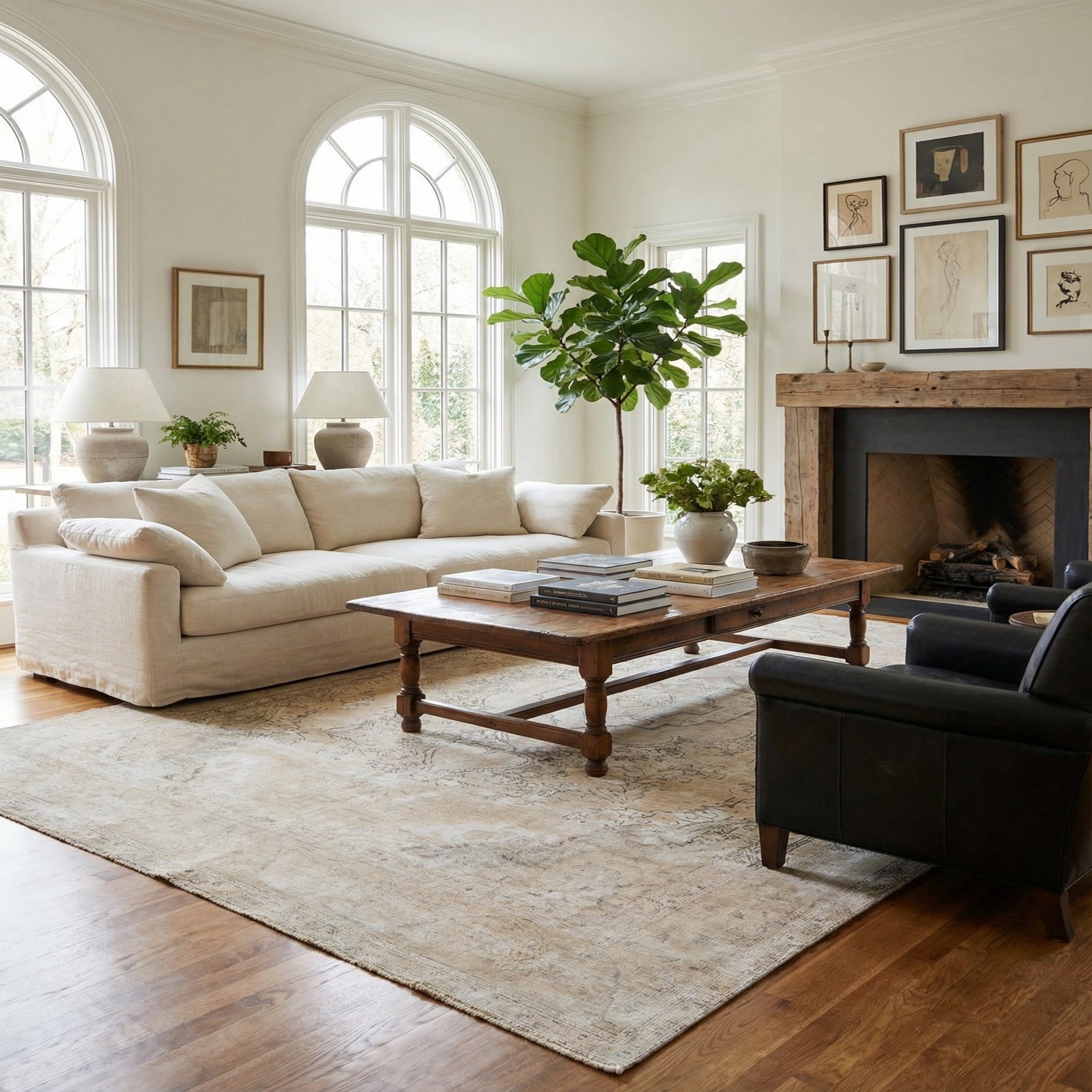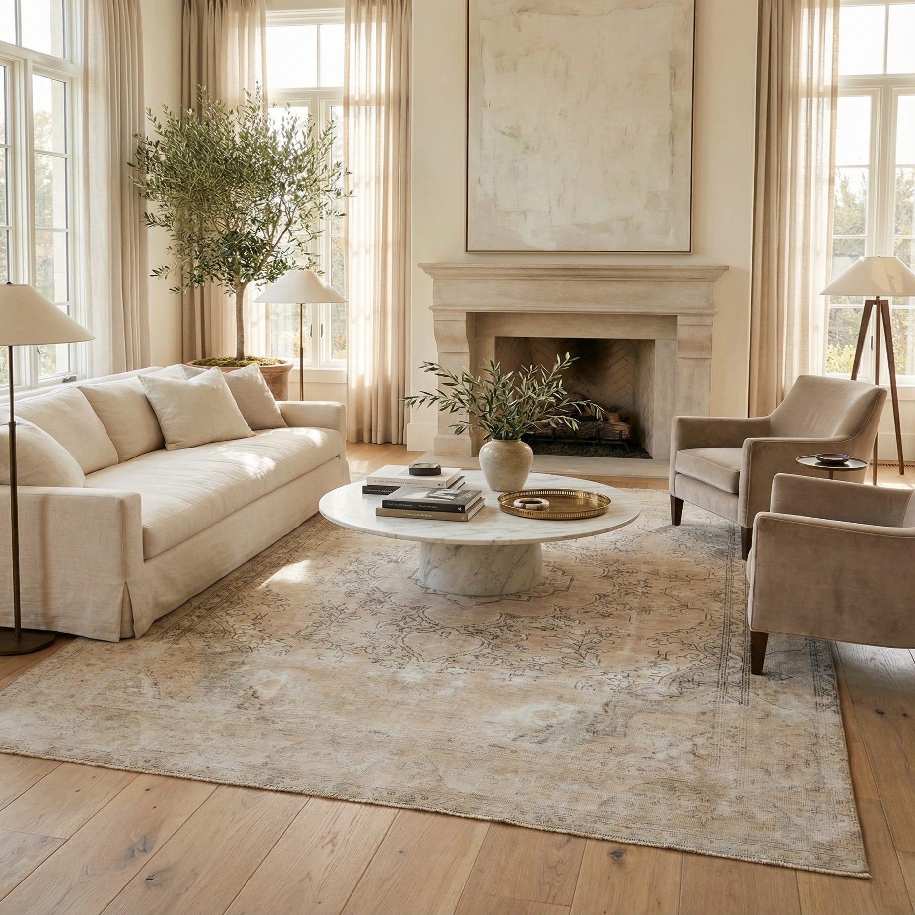 This rug's traditional pattern and neutral hues render it versatile, offering compatibility with a variety of decor styles. It would serve as a sophisticated centerpiece in a living room, adding depth to minimalist decor or harmonizing with the rich woods and leathers of a more traditional setting. In a dining area, this rug could provide a subtle, yet engaging backdrop for both casual meals and formal gatherings. Its unobtrusive color scheme allows it to blend effortlessly within a neutral palette or become a grounding element in rooms featuring bolder colors and patterns.