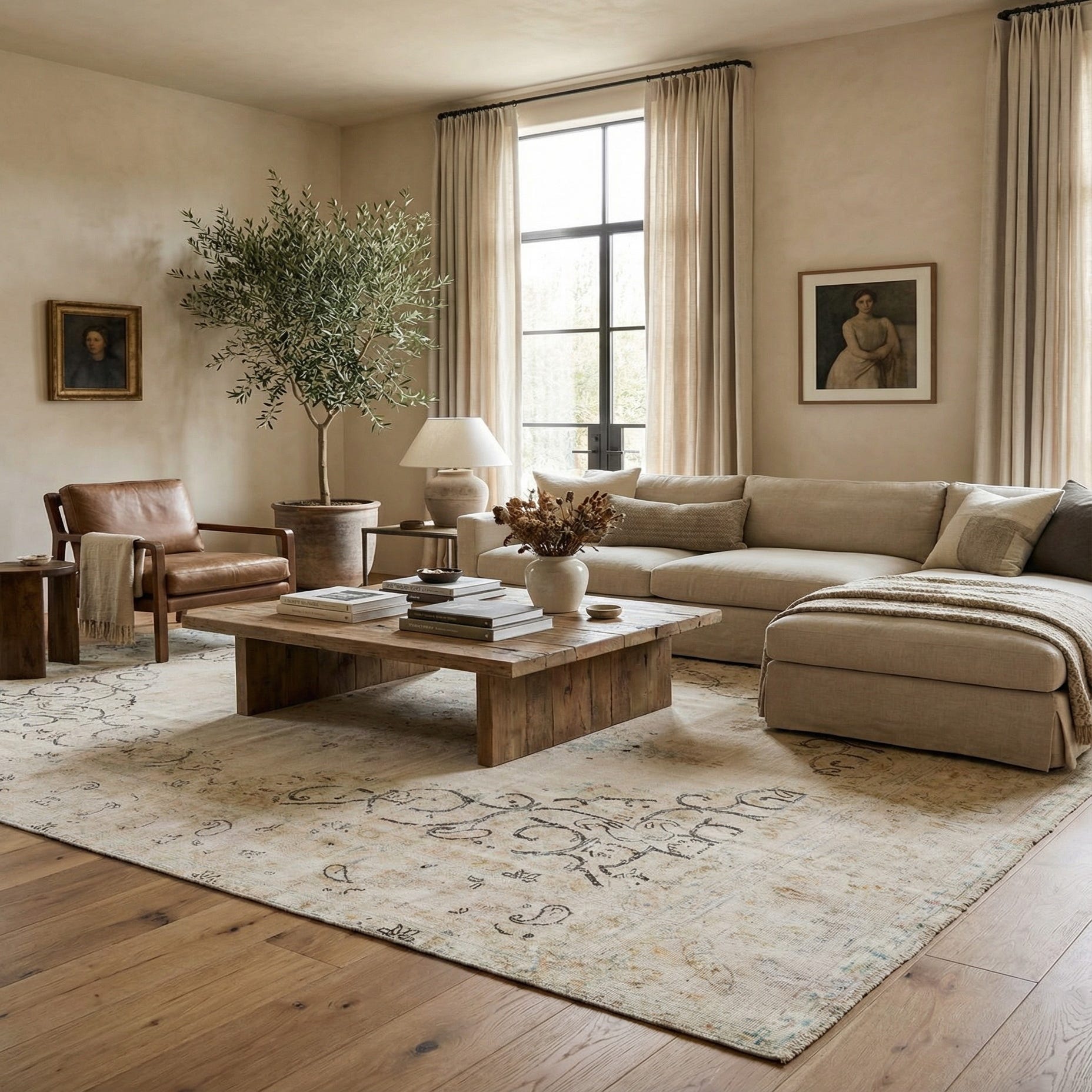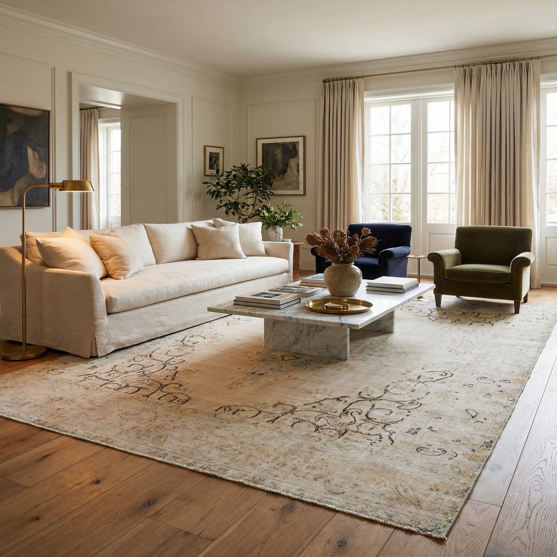 A 9x12 rectangular Ultra Vintage wool rug in cream and brown with a faded Persian medallion pattern.