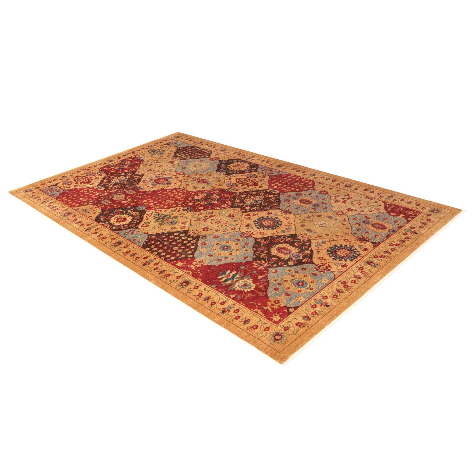 Primary color is Tan. Colors in this rug include: Tan, Red, Brown, Blue, Green, Navy Blue.