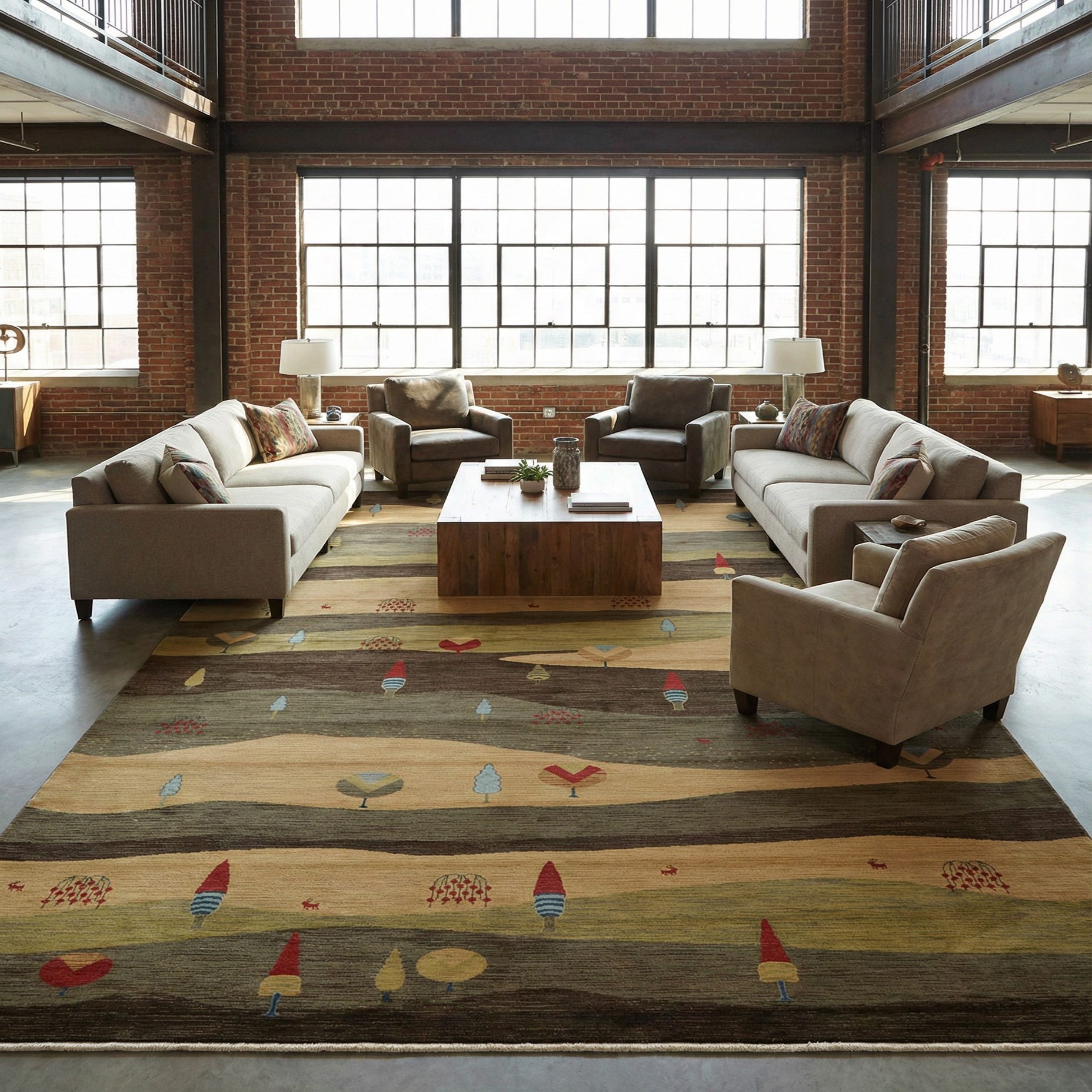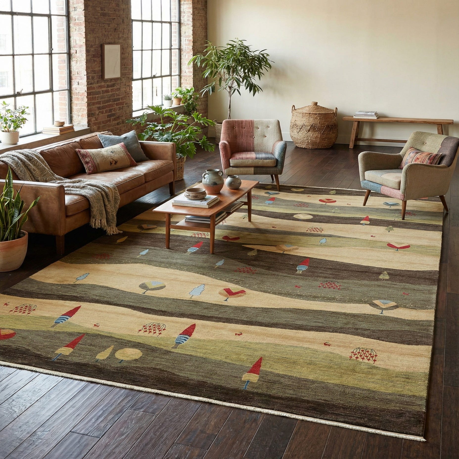 A warm tan field sets the scene for a layered, landscape-inspired design: flowing horizontal bands in beige and brown create gentle hills across the rug, while scattered stylized trees and rounded floral motifs in blue, light blue and red punctuate the surface. Small red accents—tiny animal shapes and berry-like clusters—add playful detail without overwhelming the composition. The overall look combines a modern folk-art sensibility with classic Gabbeh geometry, giving the rug both pattern and subtle movement.