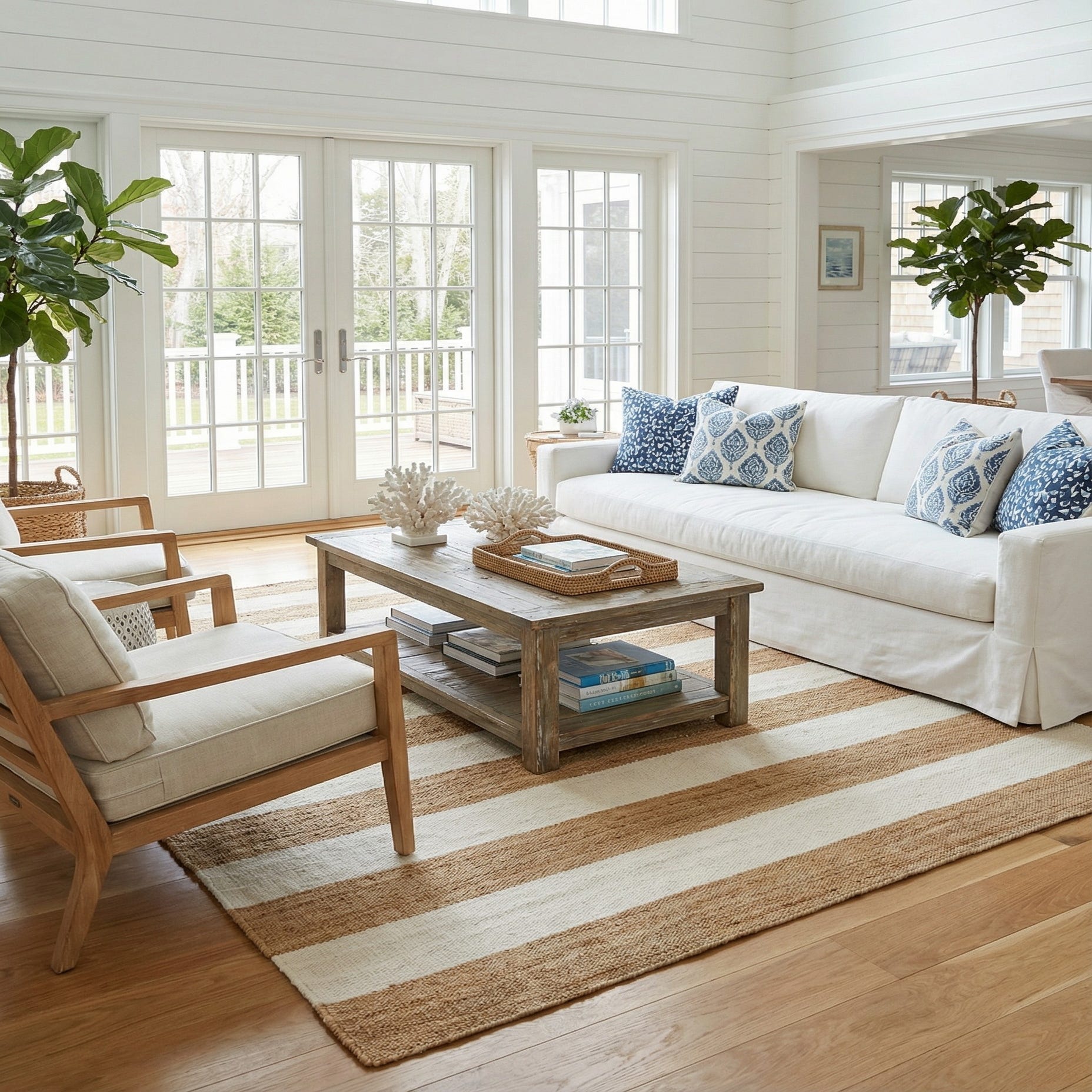 This rug works well in relaxed living rooms, sunlit dining areas, or a breezy entry where neutral tones and natural materials are the focus. Pair it with linen upholstery and light wood furniture for a Hamptons or coastal farmhouse scheme, or use it to soften a modern, minimalist space with warm, organic texture. It also layers nicely beneath a neutral sofa or under a dining table to define an open-plan seating area.