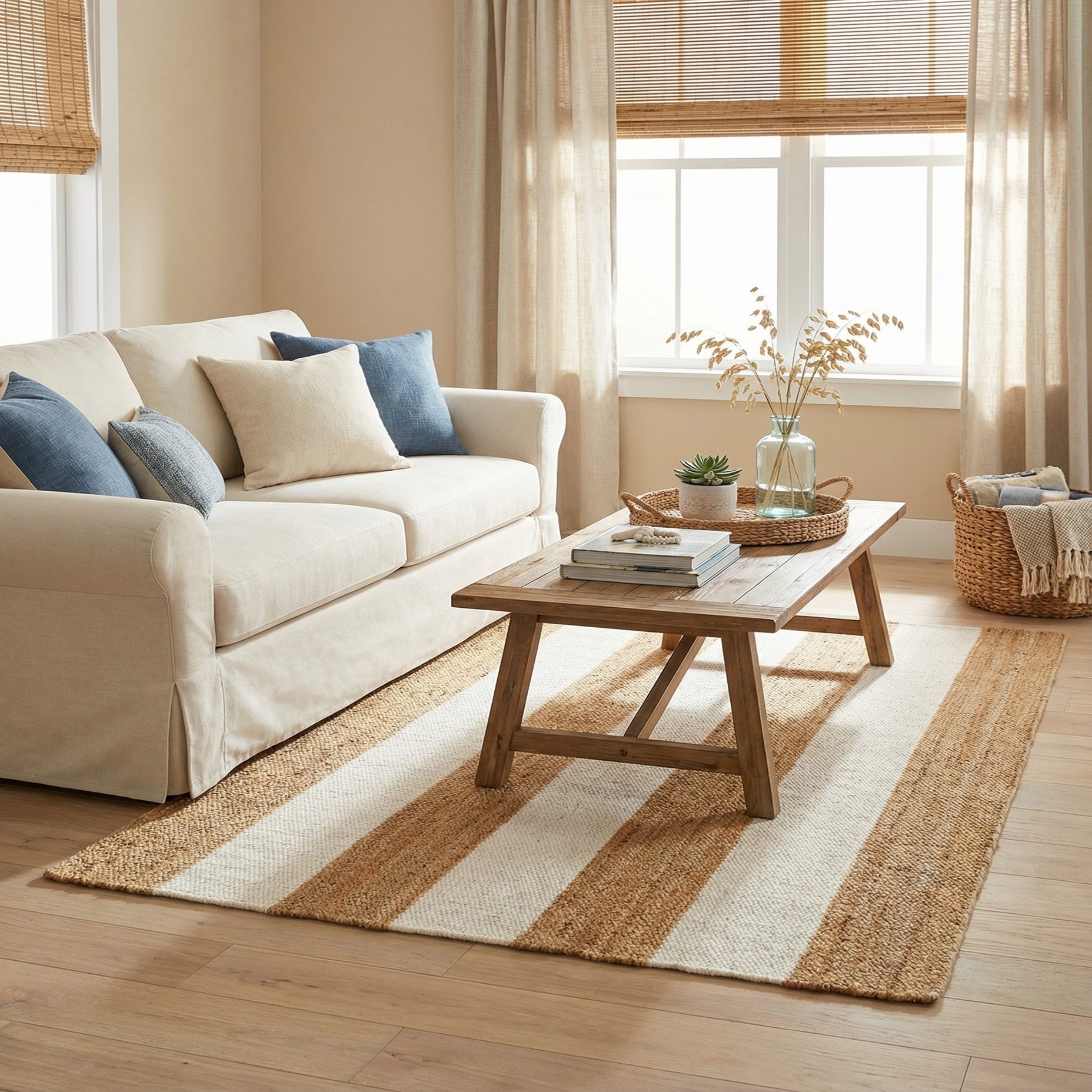 A 4x6 rectangular Jill Zarin Hamptons rug with wide alternating stripes of natural jute and cream wool, perfect for an office or living room.