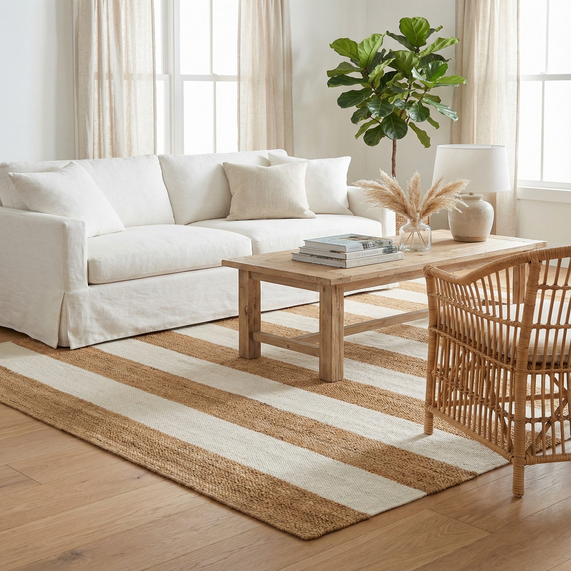 The Jill Zarin Hamptons Collection offers a tastefully understated rug handwoven of jute and wool, presenting a harmonious blend of durability and softness. Sized at 5x8 feet, this piece features a simple yet captivating striped pattern, with alternating bands of Tan Sand and Ivory hues. The background color of Tan Sand provides a warm, neutral canvas that enhances the natural texture of the materials.
