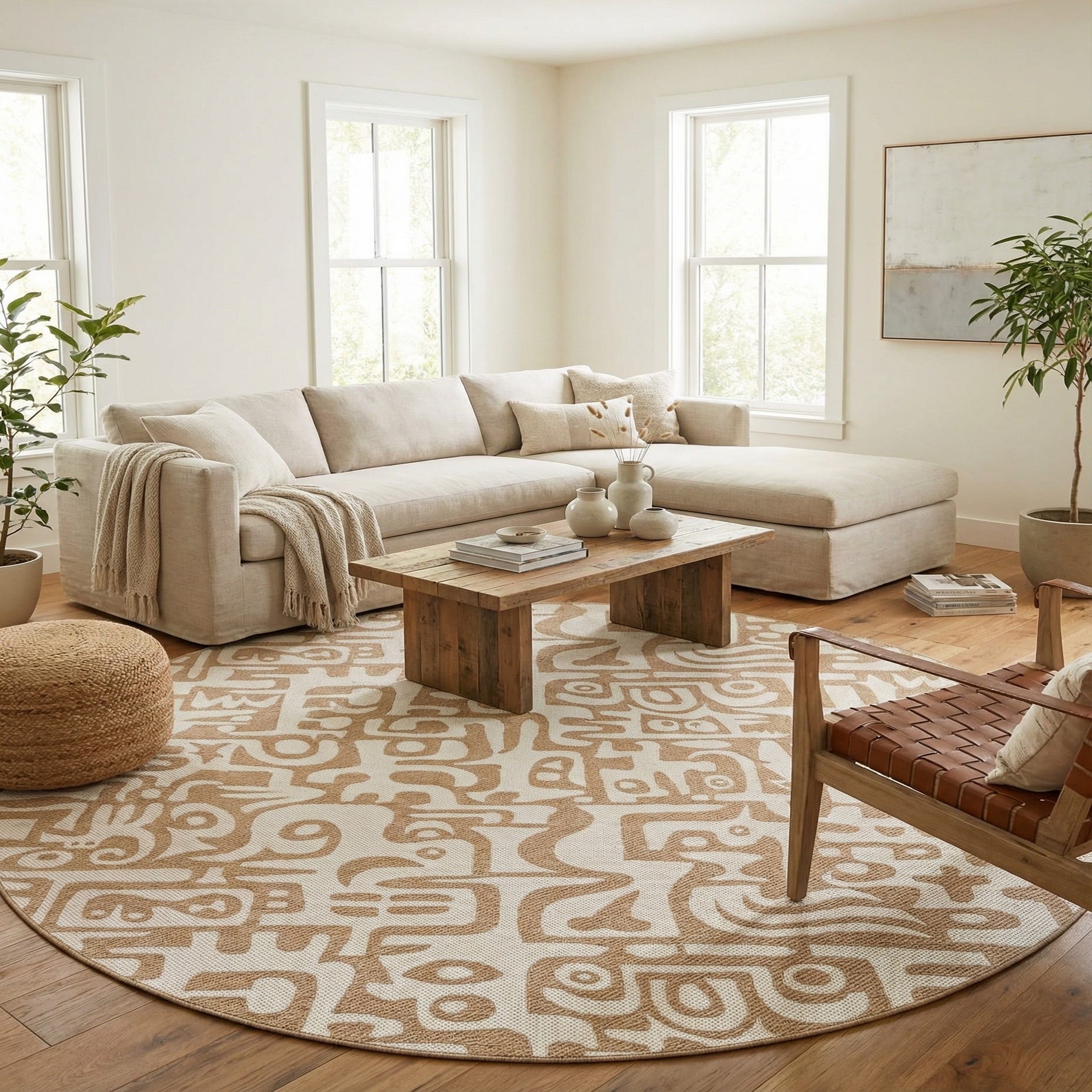 This round rug works well on a covered patio or sunroom, anchored beneath a circular dining table or a conversational seating group. It pairs naturally with light-wood furniture, rattan or wicker pieces, and linen fabrics for a modern coastal or Scandinavian-inspired palette, and it also adds a calm layer to minimalist and mid-century modern interiors. The neutral taupe and ivory palette lets it blend with both warm and cool schemes while introducing pattern without overpowering the room.