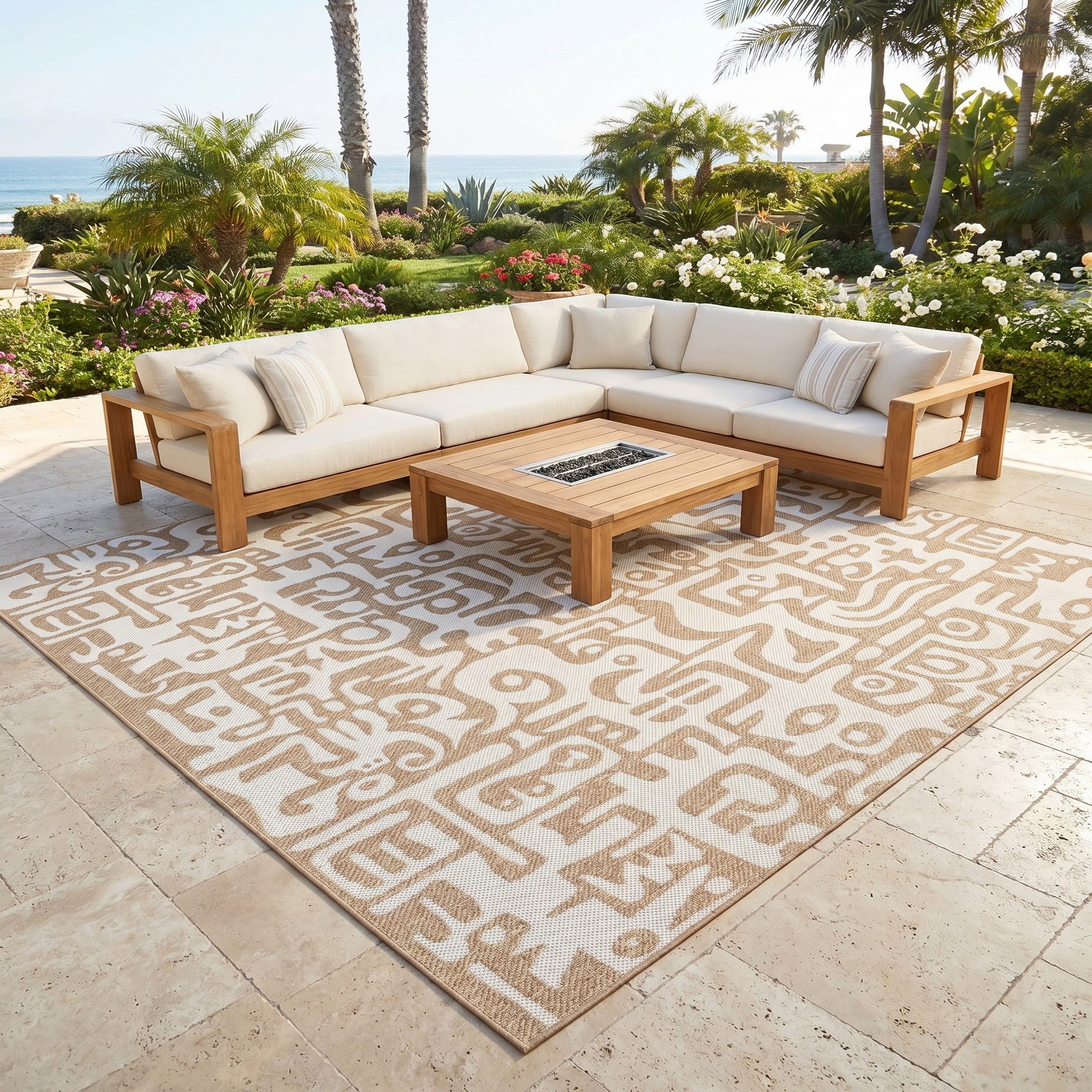 Love the contemporary look of this rug! We are so happy we chose this to accent the blue of our pool with our living area on our lanai. We still are going to add a few more pillows but love the rug to add color.
