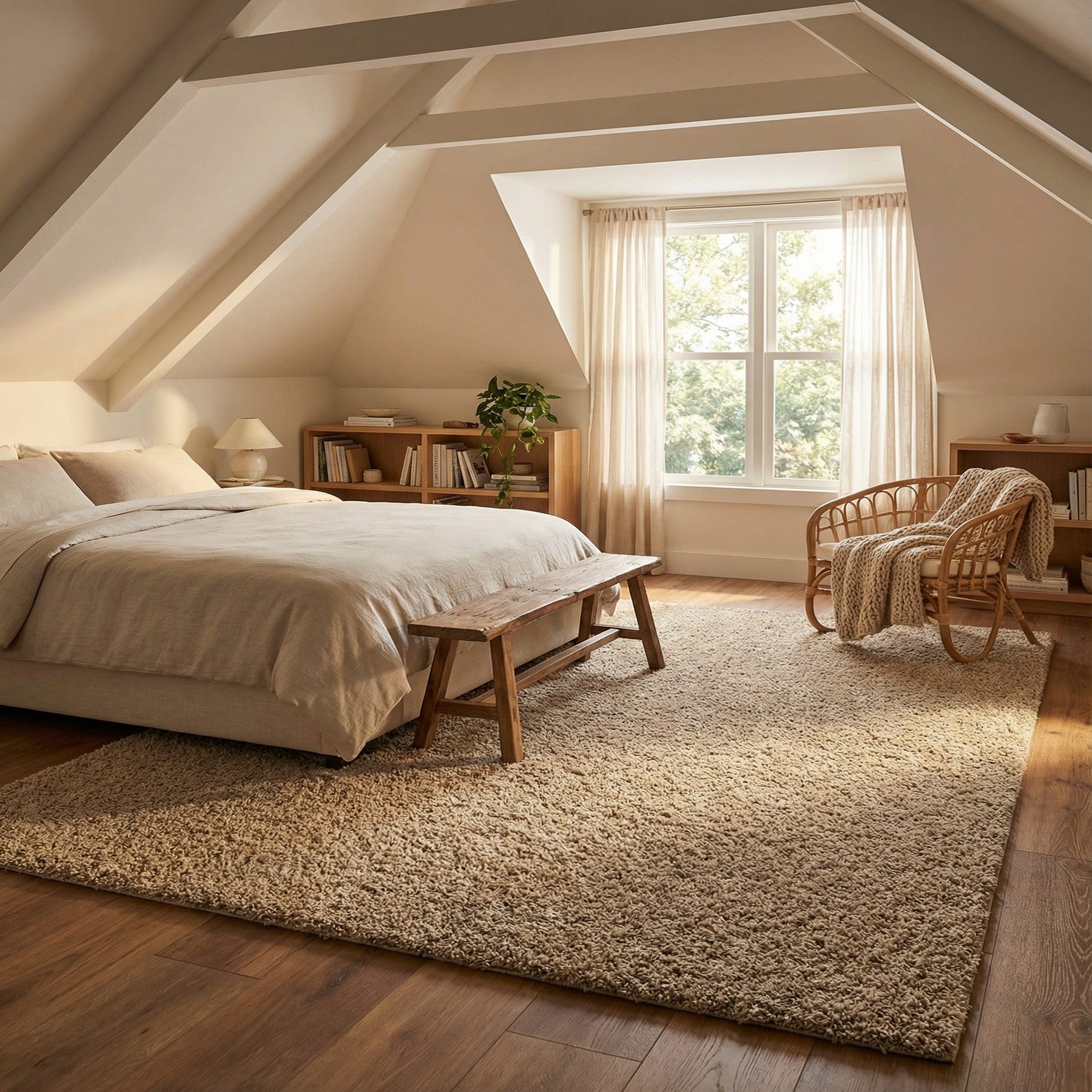 This rug works well where comfort is a priority: beneath a living room seating group, layered at the foot of the bed, or anchoring a cozy reading nook. Its neutral taupe pairs naturally with warm woods, leather seating, and muted color palettes in transitional, modern farmhouse, or casual contemporary interiors. Use it to soften hard floors and introduce a touch of warmth to everyday spaces.