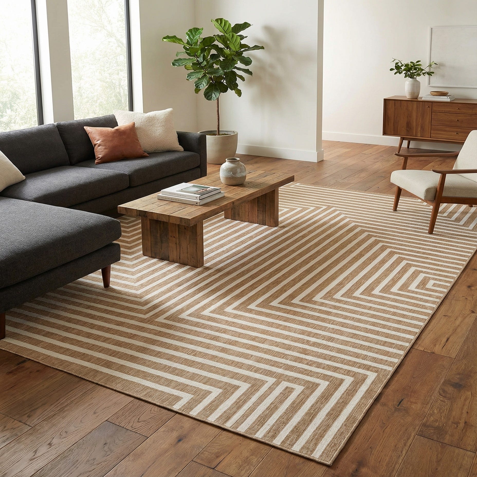A crisp geometric maze of ivory lines frames a warm taupe field, creating a modern, structured look that anchors a space without overwhelming it. The repeating right-angle stripes form a balanced, symmetrical pattern that feels both architectural and calm. Machine made from 100% polypropylene, the rug has a low-profile weave with a slightly ribbed surface that’s smooth underfoot and visually textured where the ivory lines meet the taupe background.