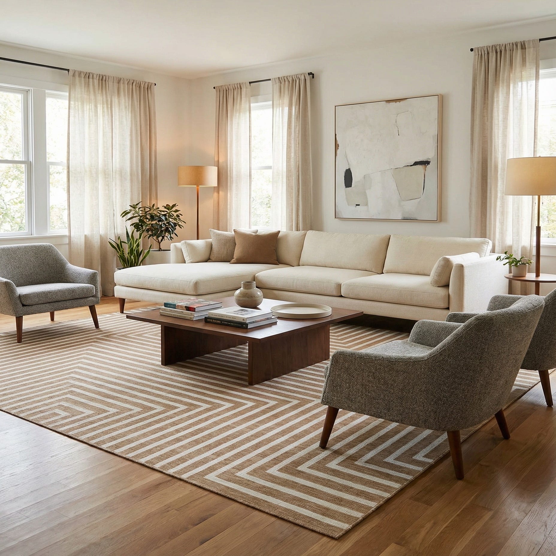 This rug works well to define a patio seating area, ground an minimalist living room, or add tailored contrast beneath a glass-top dining table on a covered porch. Its neutral taupe and ivory palette pairs naturally with natural woods, rattan or wicker pieces, crisp white furnishings, and navy or charcoal accents for a layered, contemporary look.