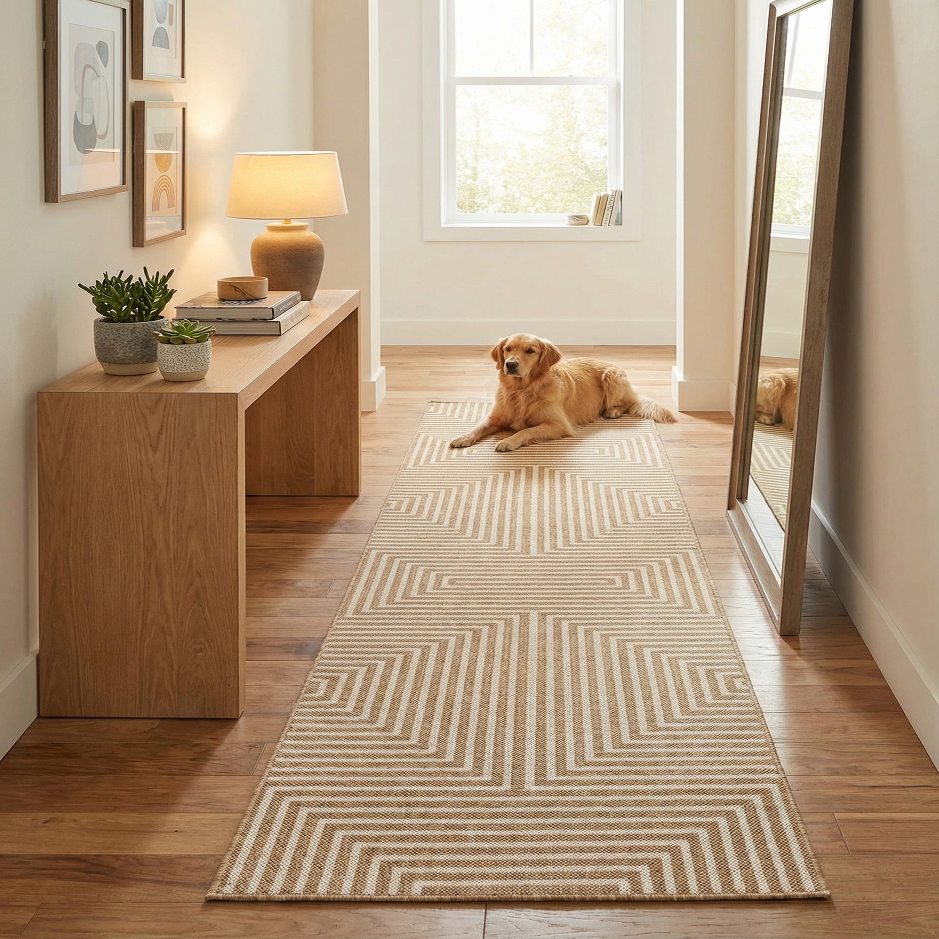 A 12 ft runner rug with a modern abstract pattern of interlocking brown and ivory stripes, ideal for a hallway or patio.