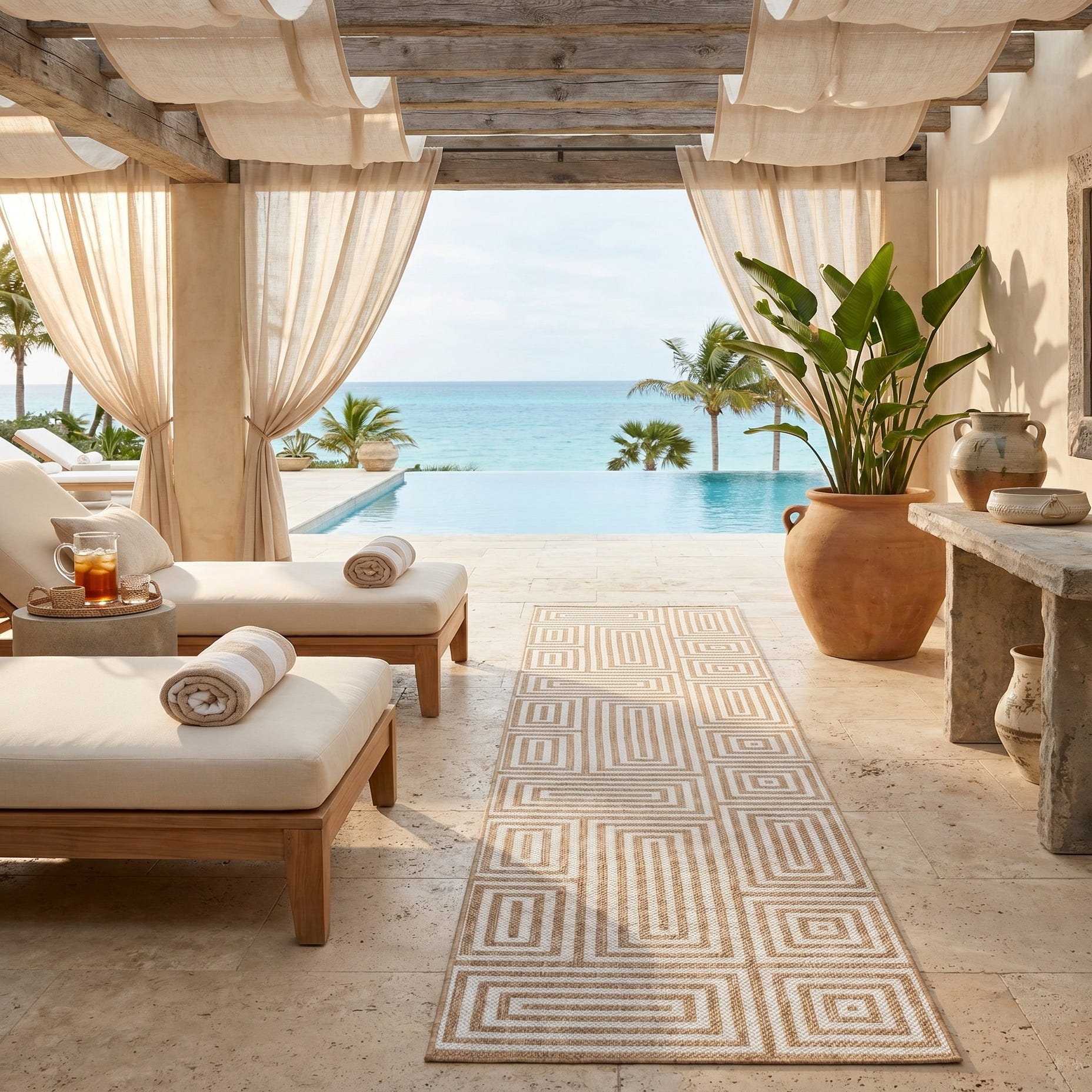 Love the contemporary look of this rug! We are so happy we chose this to accent the blue of our pool with our living area on our lanai. We still are going to add a few more pillows but love the rug to add color.