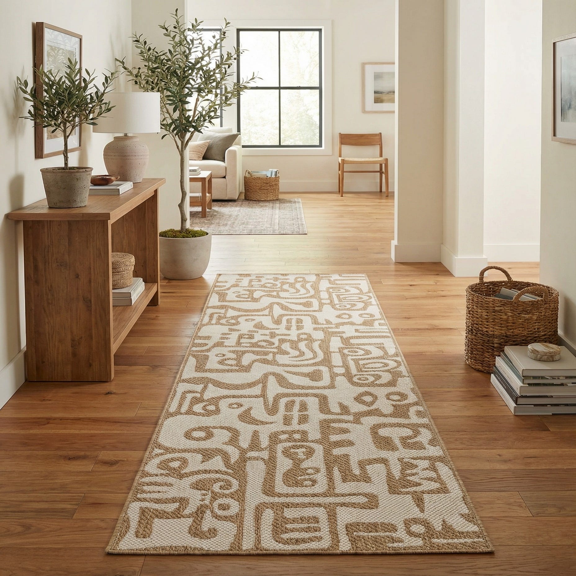 A 12 ft runner rug with an abstract brown and ivory pattern, suitable for hallways or patios.