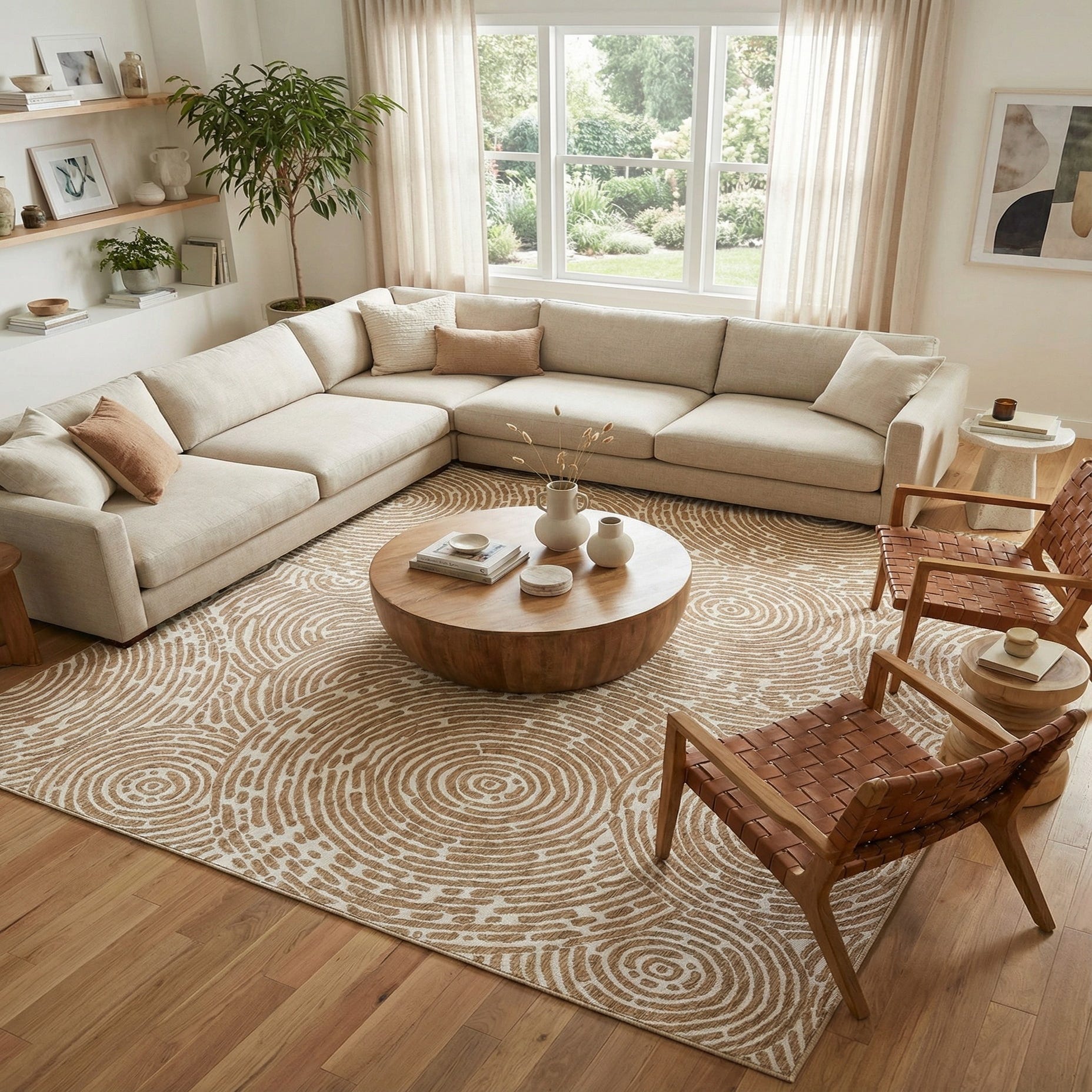 A 12' square modern indoor/outdoor rug with an abstract pattern of concentric tan circles and organic lines on an ivory background.