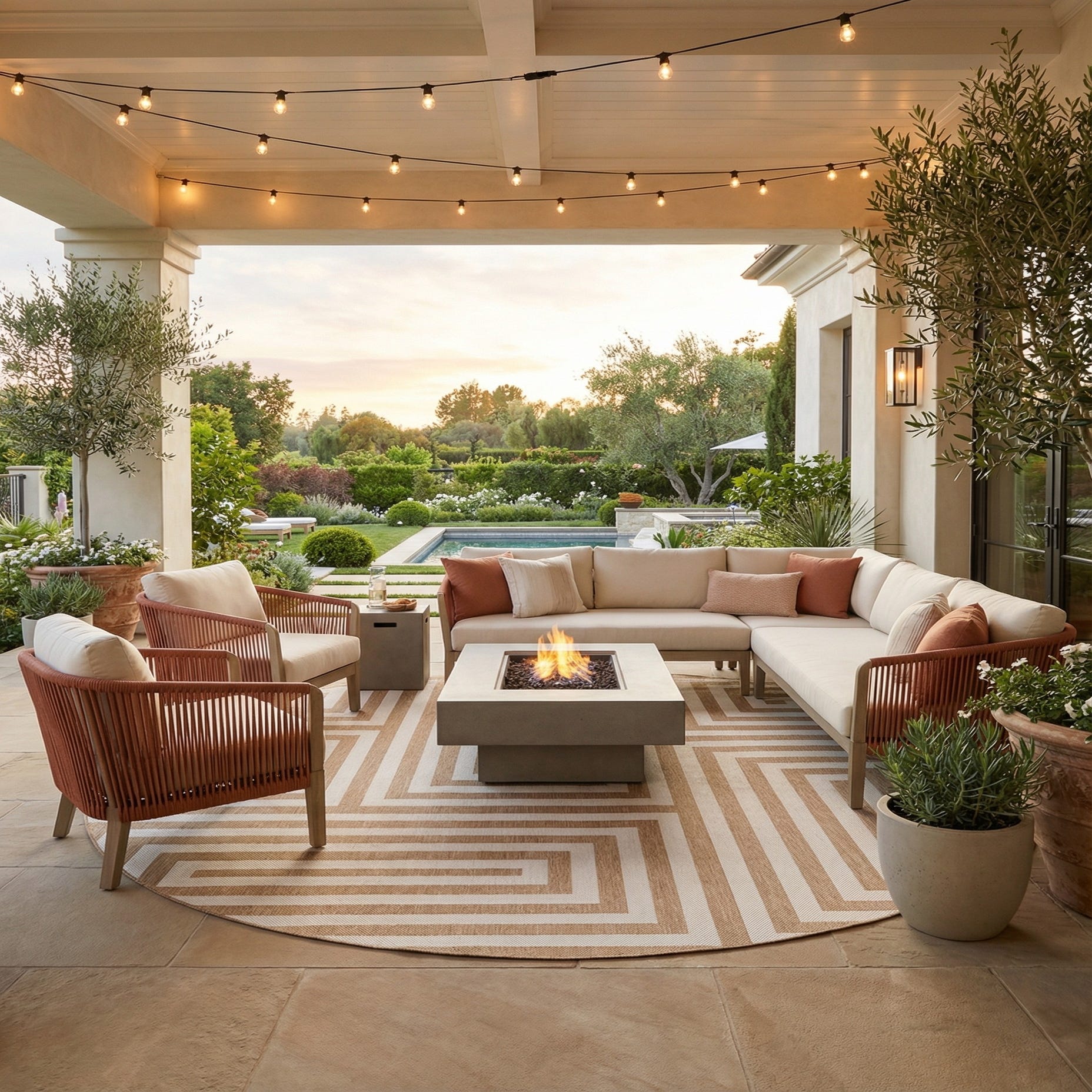 This rug works well as an anchor for a covered patio seating area, beneath a round dining table, or centered under an outdoor conversation group. Pair it with warm wood furniture and linen cushions for a relaxed, coastal-meets-modern look, or combine with black metal frames and navy accents for a cleaner, mid-century-inspired scheme. Its neutral taupe and white palette makes it easy to layer with textured throws and potted greenery for a composed, approachable outdoor living or transitional interior setting.