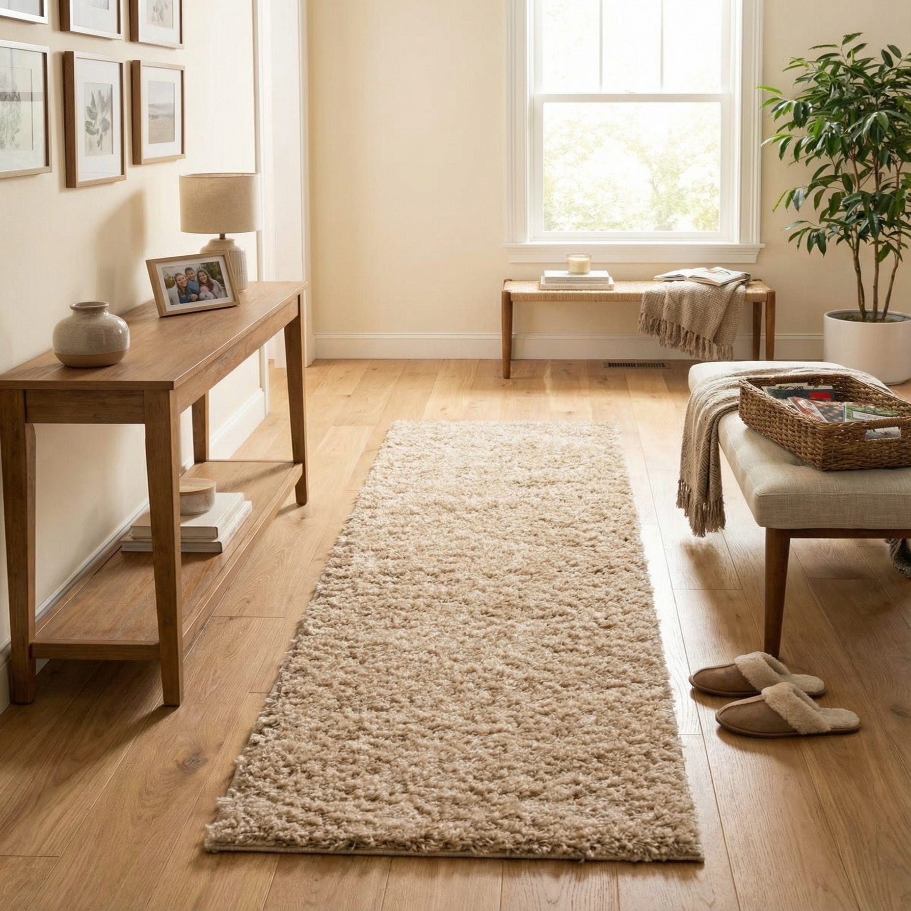 A long, rectangular 13 ft runner rug in a solid light brown and tan shag texture, ideal for a hallway.