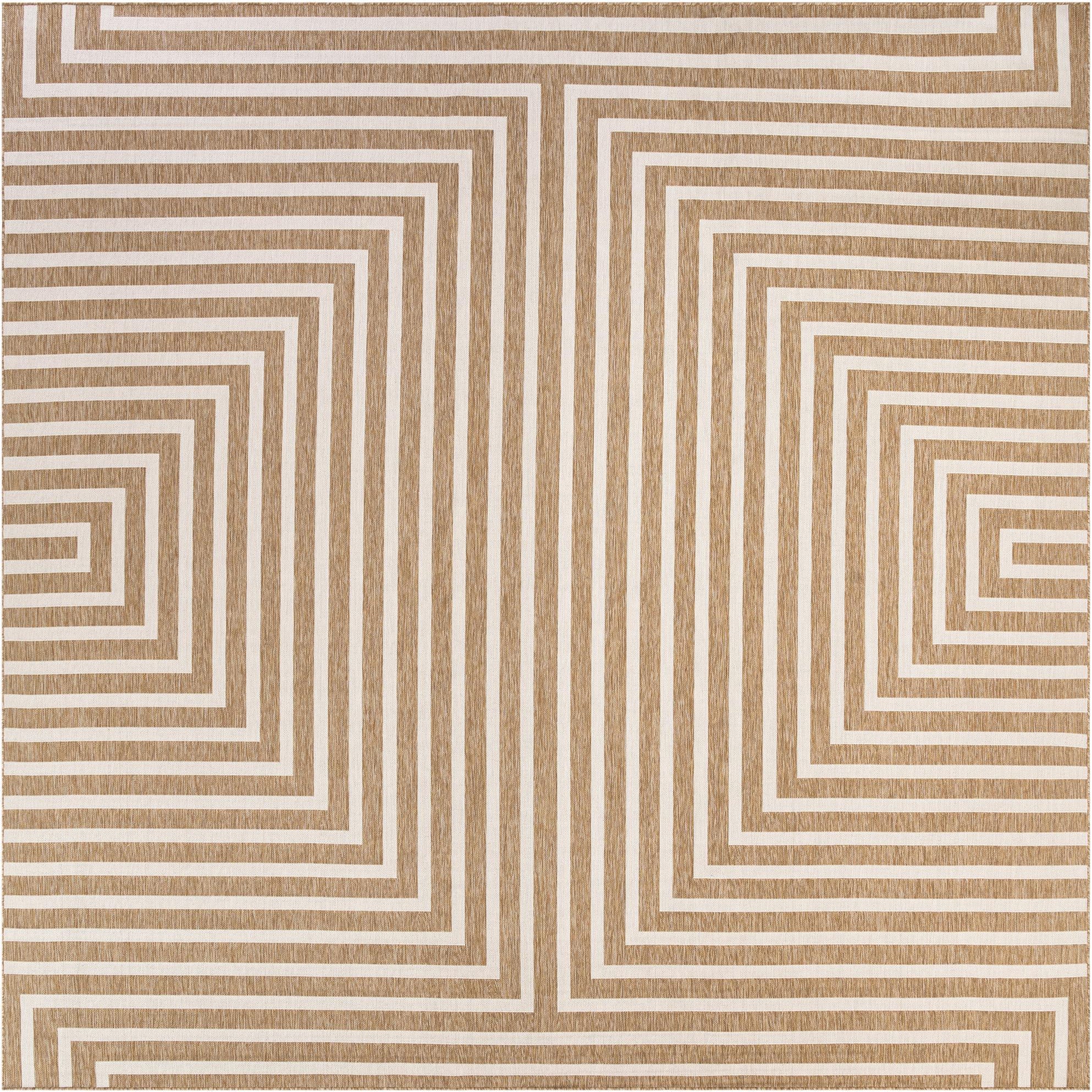 A 13' square modern outdoor rug in brown and ivory, featuring a bold geometric maze pattern of concentric squares.