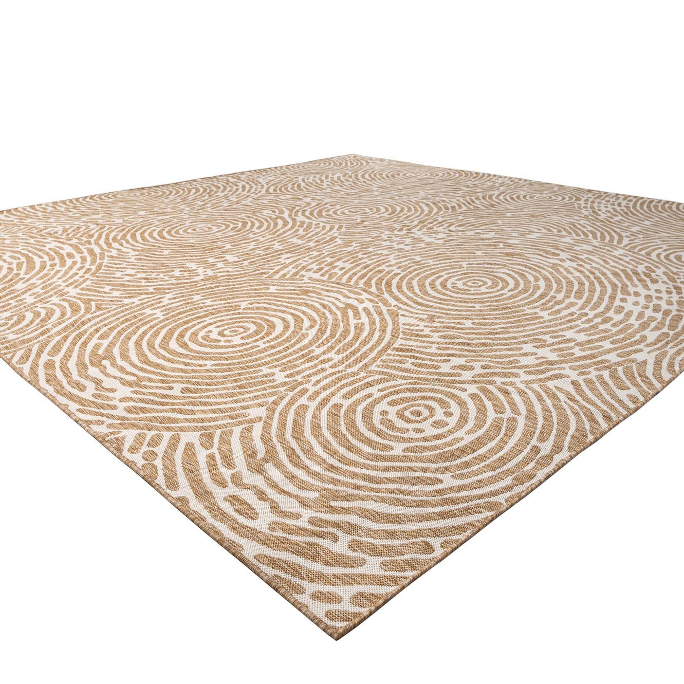A 13' square modern indoor/outdoor rug featuring an abstract concentric circle pattern in brown and cream.
