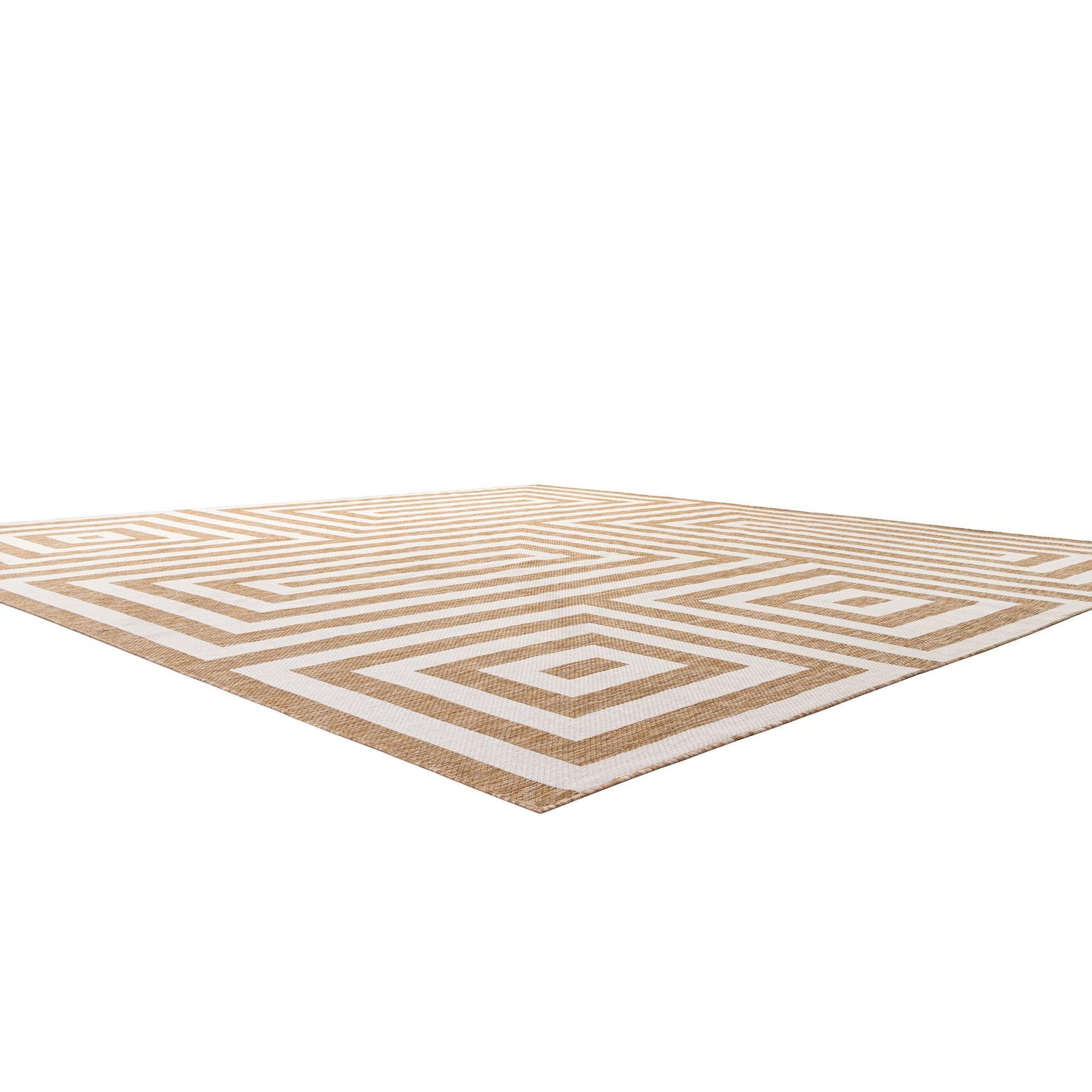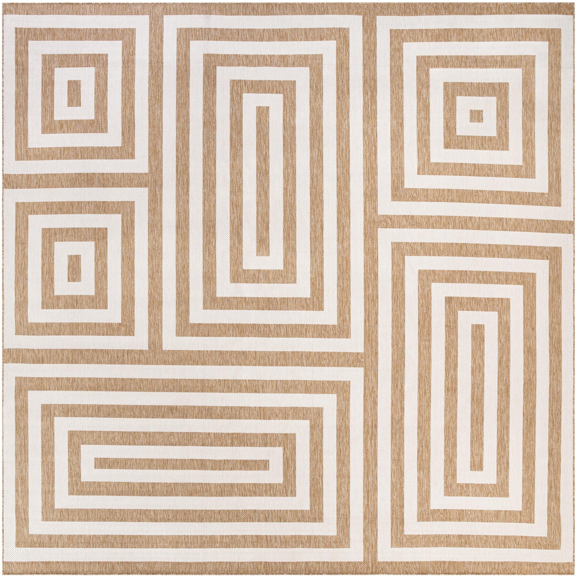 A 13' square brown and ivory modern outdoor rug with a bold geometric maze pattern, ideal for a patio.