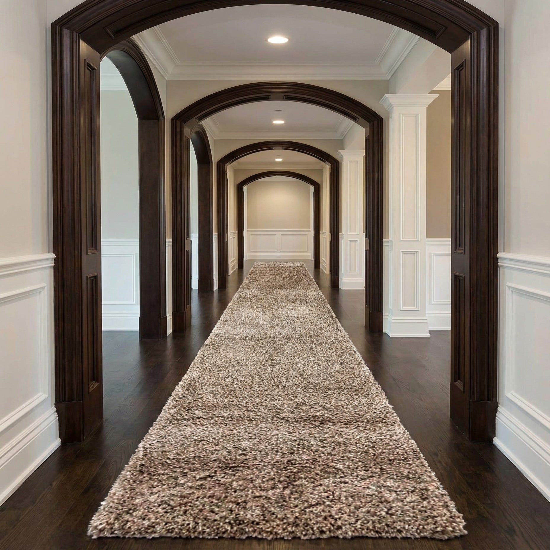 A long, rectangular 20 ft runner rug in a solid brown and tan shag texture, ideal for a hallway.